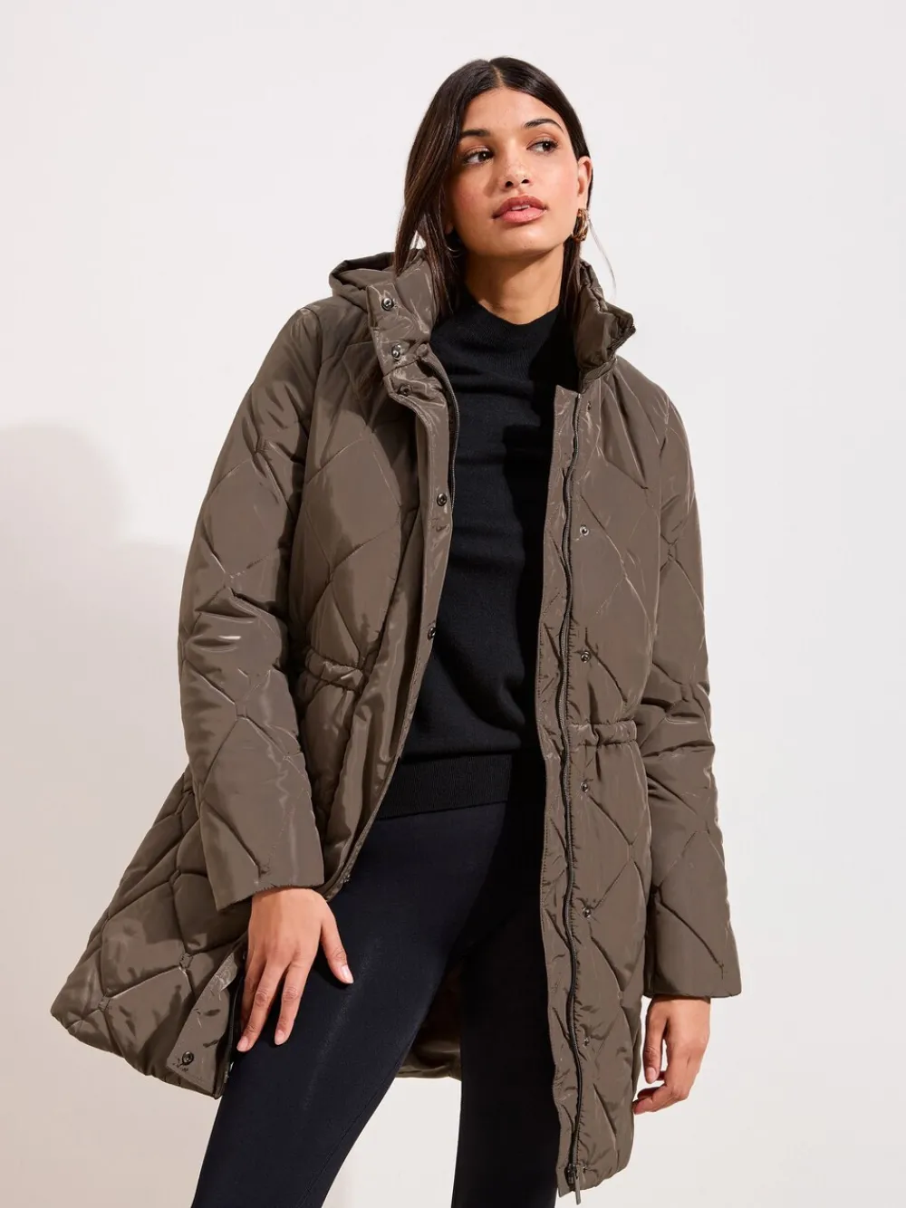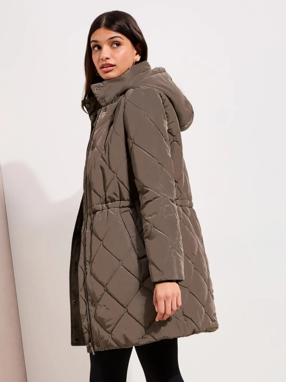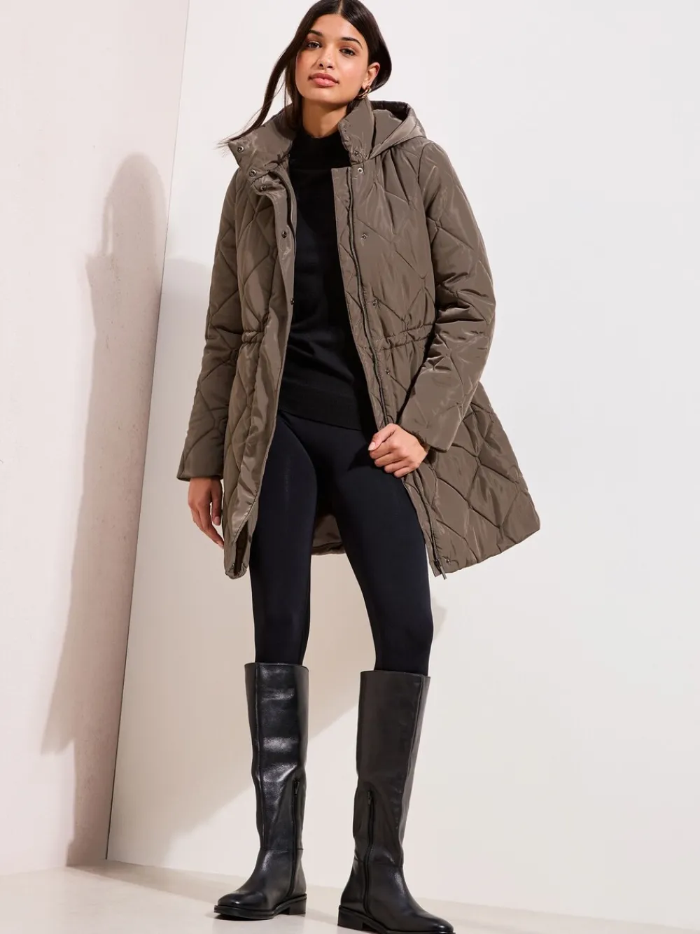Stay warm and stylish this season in this essential padded coat. The mid-length silhouette and internal elasticated fastening offer a flattering fit and extra protection against the cold. Featuring a practical hood and side pockets, this is a timeless winter wardrobe staple. Warm padded design Hood with poppers Internal elasticated fastening Side pockets Hoofdzakelijk 100% polyester. Voering 100% polyester. Vulling 100% polyester.