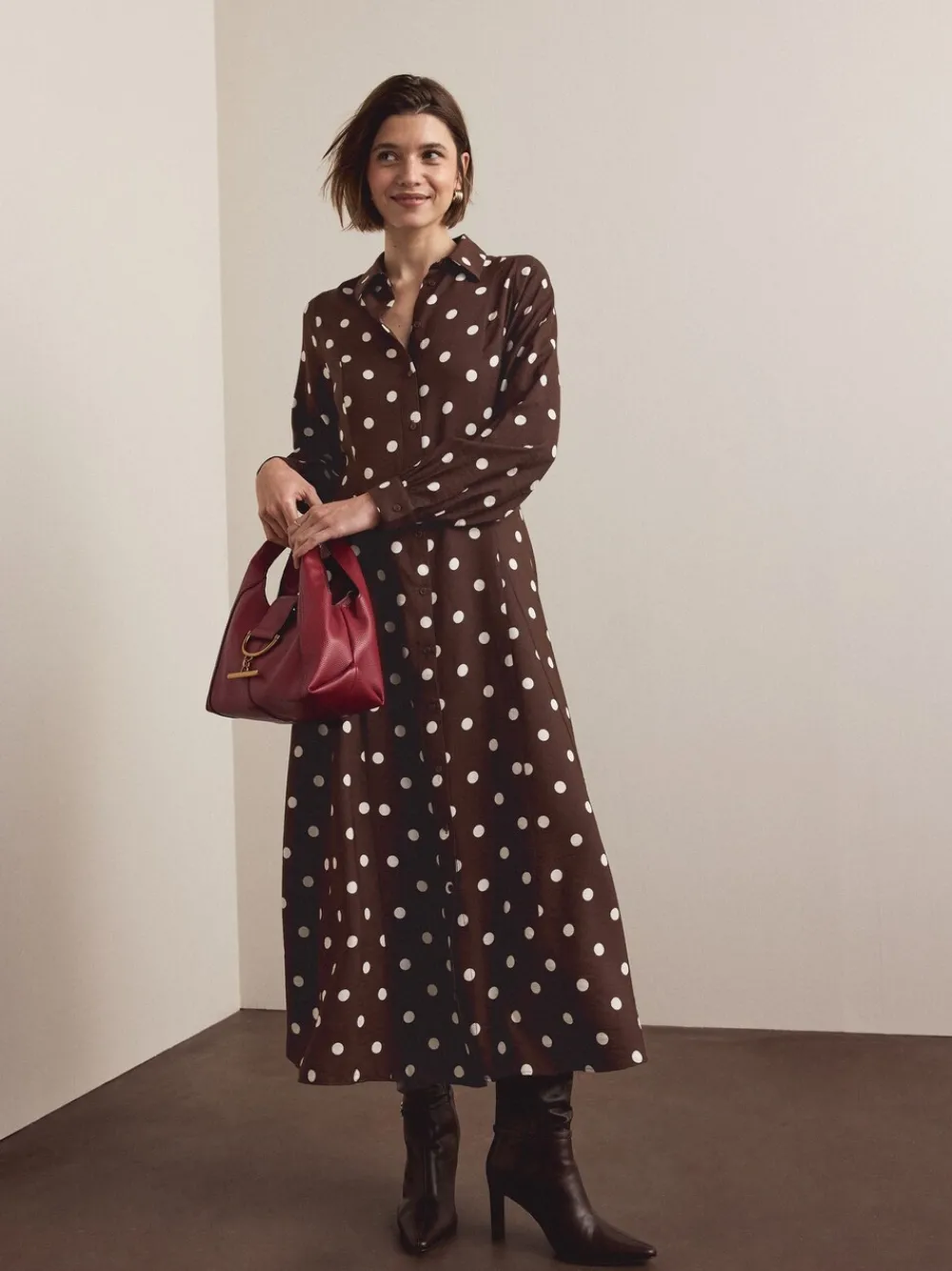 The classic shirt-dress silhouette lends a foundation of polished refinement and timeless elegance. The dress is professional enough for a meeting but stylish enough for an evening out. Button through Shirt collar Fuller bust option Long sleeve Midi length Standaardmaat van de zijkant van de nek tot de zoom 52.5″ / 133 cm. Machinewasbaar. 87% LENZING™ ECOVERO™-viscose, 13% nylon. Artikelen met het curve-logo zijn verkrijgbaar in de maten 18 en groter.