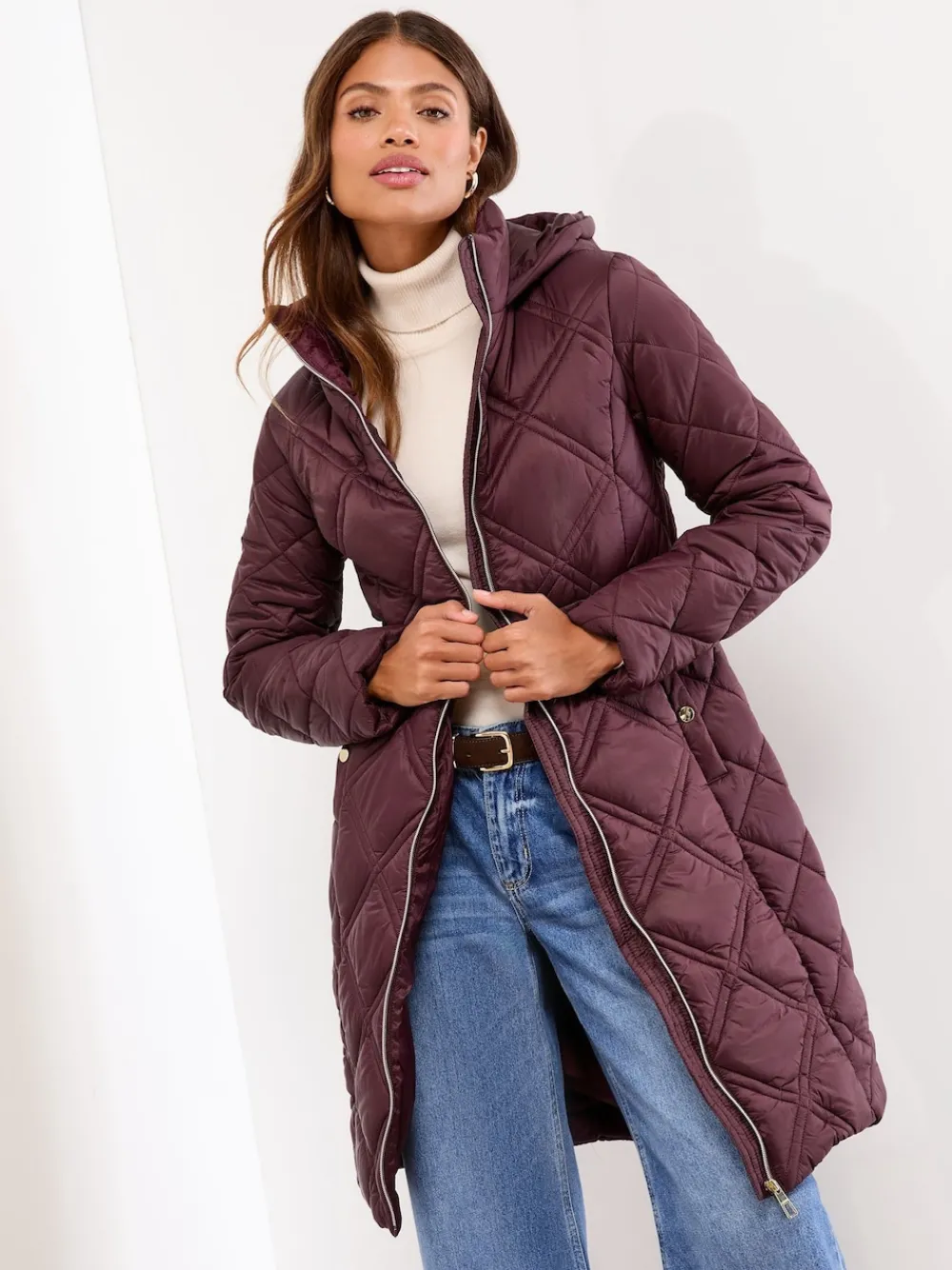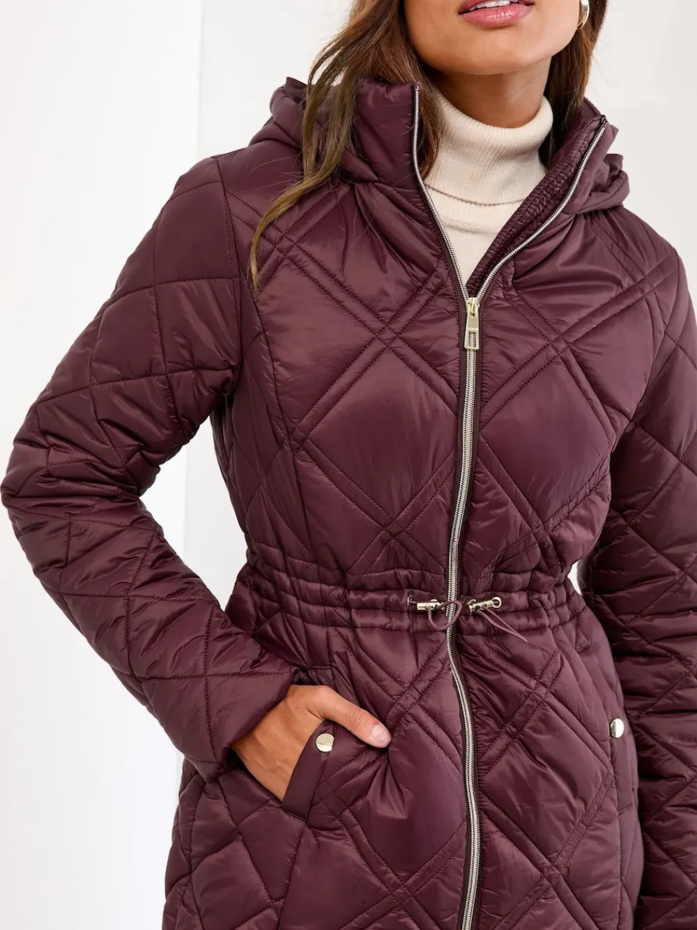Brave the cold in style with this elegant mid-length padded coat. The all-over quilting and cosy hood provide essential warmth, while the adjustable drawcord waist ensures a flattering, customised fit. Finished with stylish shiny gold hardware on the zip and buttons, this coat is a sophisticated winter staple.Mid-length padded coatAdjustable drawcord waistProtective hoodQuilted constructionShiny gold zip and buttons Materiaal 100% nylon. Voering 100% polyester. Vulling 100% polyester.