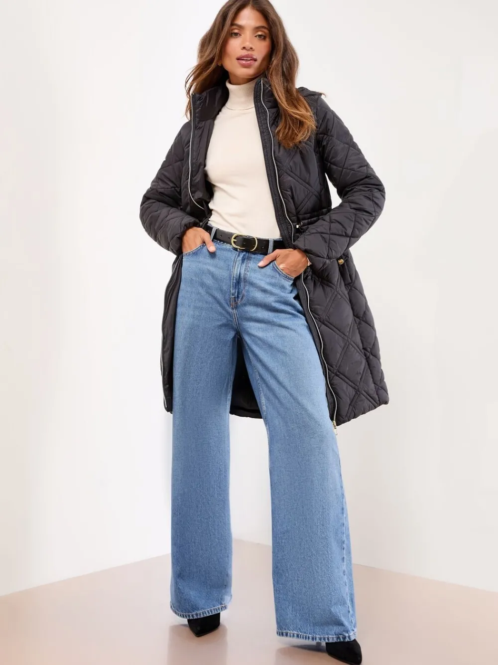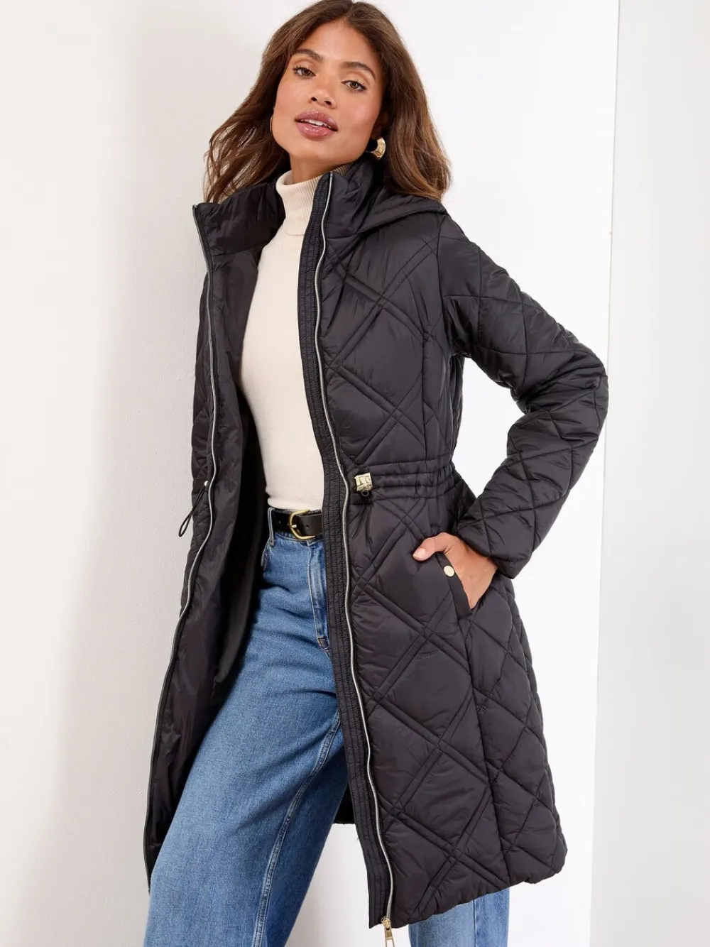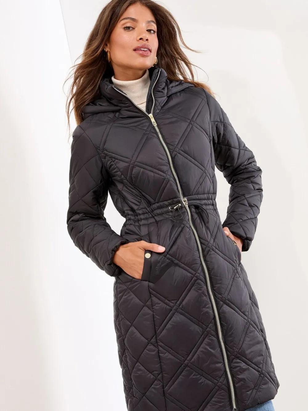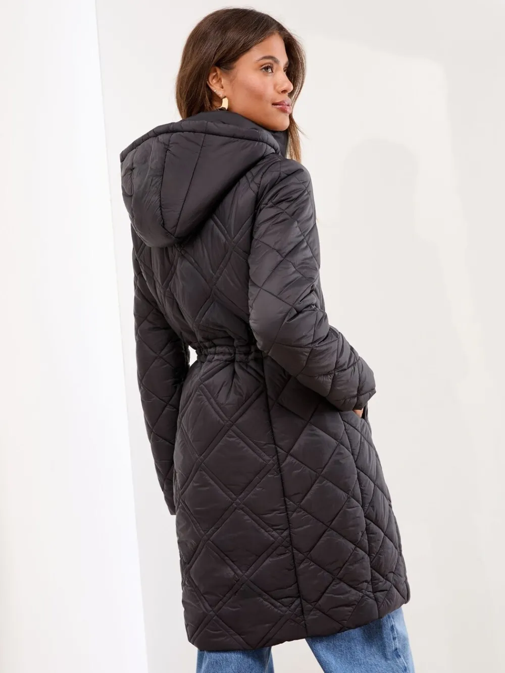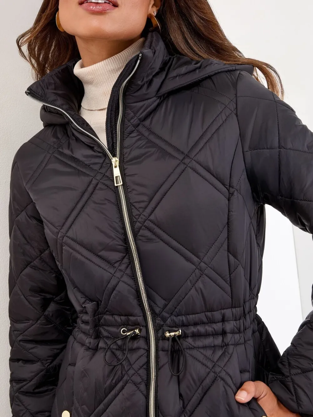 Brave the cold in style with this elegant mid-length padded coat. The all-over quilting and cosy hood provide essential warmth, while the adjustable drawcord waist ensures a flattering, customised fit. Finished with stylish shiny gold hardware on the zip and buttons, this coat is a sophisticated winter staple. Mid-length padded coat Adjustable drawcord waist Protective hood Quilted construction Shiny gold zip and buttons Materiaal 100% nylon. Voering 100% polyester. Vulling 100% polyester.