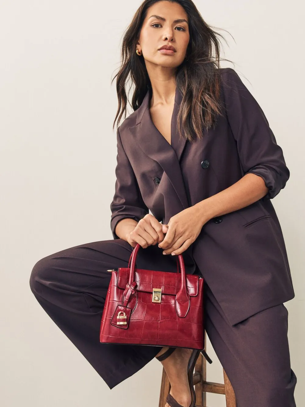 This vibrant red croc-effect bag has a high shine finish and is perfect for desk to dinner elegance. Features an optional strap for versatile, hands free wear. Hand-held bag Croc-effect finish Optional cross-body strap Front flap with clasp detail Zip fastening 3 compartments Hoogte 20 cm Breedte 25,5 cm Diepte 10 cm Bovenkant 100% polyurethaan. Voering 100% gerecycled polyester.