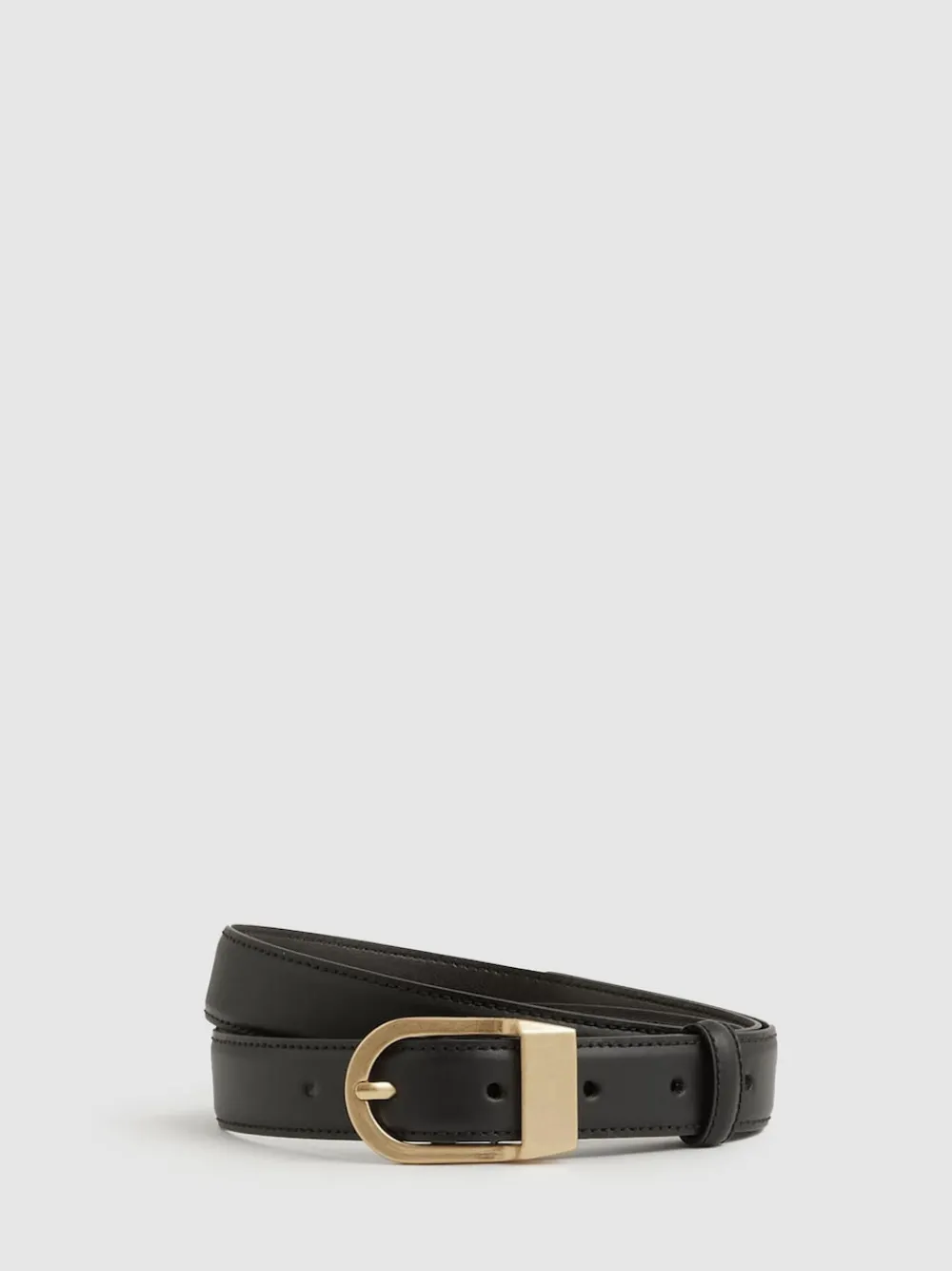 The Black Hazel belt is crafted from smooth leather for a refined finish. Its curved metal buckle adds a touch of timeless simplicity, making it a versatile wardrobe staple. 100% Leather Curved buckle fastening Breedte 3,5 cm 100% leer.
