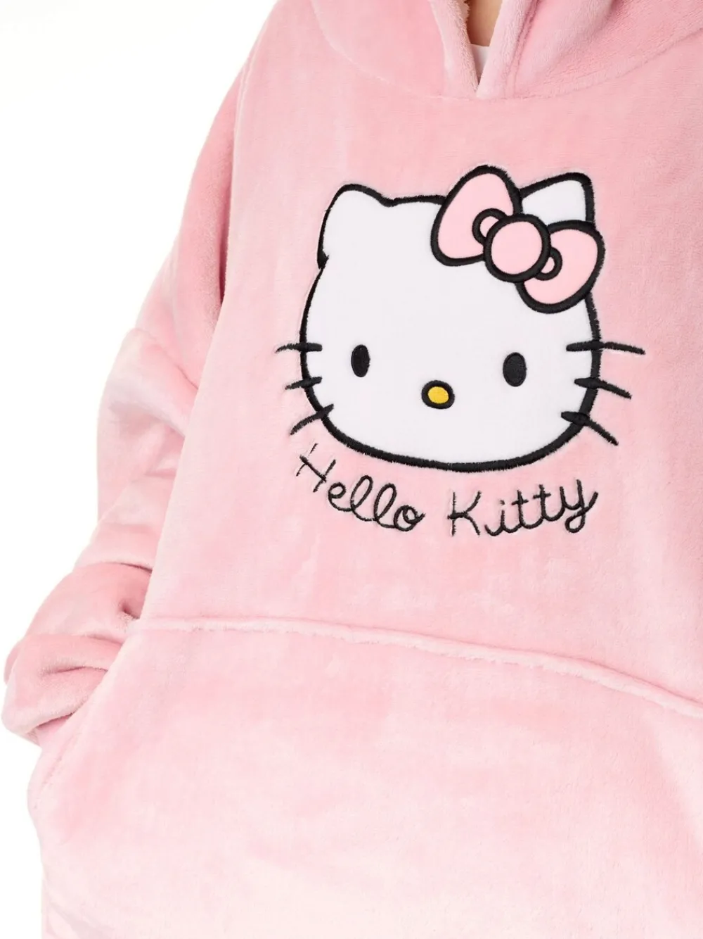 Kruip stijlvol tegen elkaar aan met deze schattige Hello Kitty-hoodie met dekentje voor volwassenen! Deze Hoodie is gemaakt van superzachte, pluche stof en heeft het geliefde Hello Kitty-design, wat een vleugje schattigheid toevoegt aan je Loungewearcollectie. Machinewasbaar. 100% polyester.