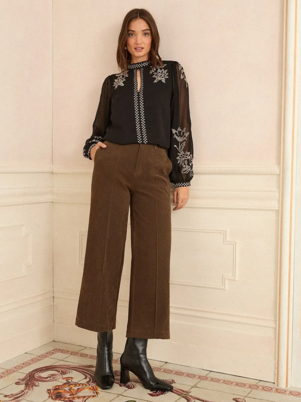 Make a glamorous statement with the Love & Roses Black Gold Embroidery Long Sleeve High Neck Blouse. Crafted in sheer black fabric, this luxurious blouse is heavily embellished with intricate gold-tone embroidery, featuring elaborate floral motifs on the shoulders and sleeves and linear detailing down the front. The design includes an elegant high neck with subtle gathering and a delicate keyhole cutout. The voluminous long sleeves complete this sophisticated and detailed piece, perfect for elevating any evening ensemble. Embroidery detailing Long sleeve Keyhole cutout Hoofdmateriaal 100% polyester. Voering 100% polyester. Borduurwerk 65% polyester, 35% gemetalliseerde vezels.