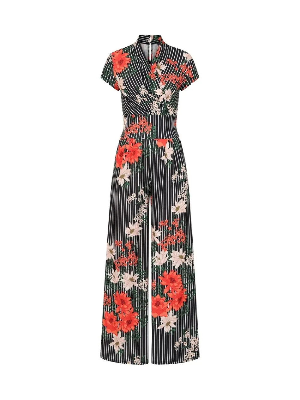 HotSquash – Zwarte gebloemde jumpsuit met krijtstreep en wijde pijpen*Hot Squash Clearance
