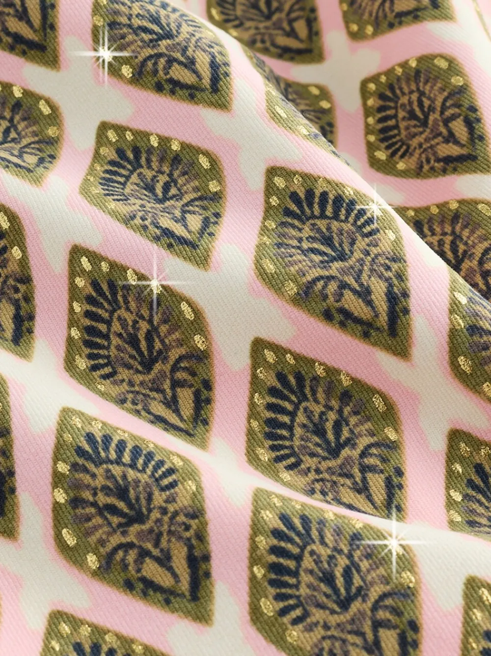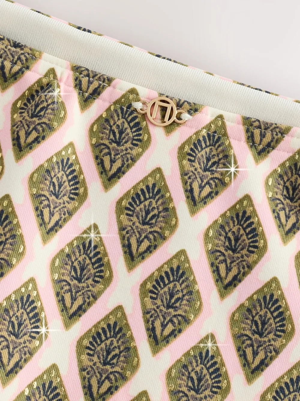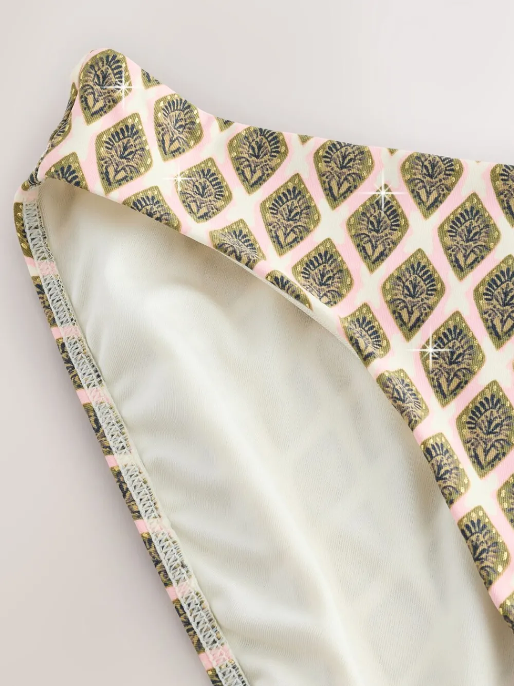 These high leg bikini bottoms feature a stylish khaki and cream woodblock print with foil detail. The improved fit has a slightly higher rise for a more flattering look. Crafted from fabric providing SPF 50+ protection, they offer essential sun safety without compromising on style. High leg cut Improved, slightly higher rise fit Khaki/cream woodblock foil print Provides SPF 50+ protection Hoofdbestanddeel 85% nylon, 15% LYCRA® XTRA LIFE™ elastaan. Voering 92% gerecycled polyester, 8% elastaan. Artikelen met het curve-logo zijn verkrijgbaar in de maten 18 en groter. LYCRA® XTRA LIFE™-vezel zorgt ervoor dat je ondergoed er langer als nieuw uitziet, met langdurig comfort en pasvorm. Dit innovatieve stretchmateriaal weegt weinig, ademt en behoudt zijn vorm bij telkens weer dragen en wassen.