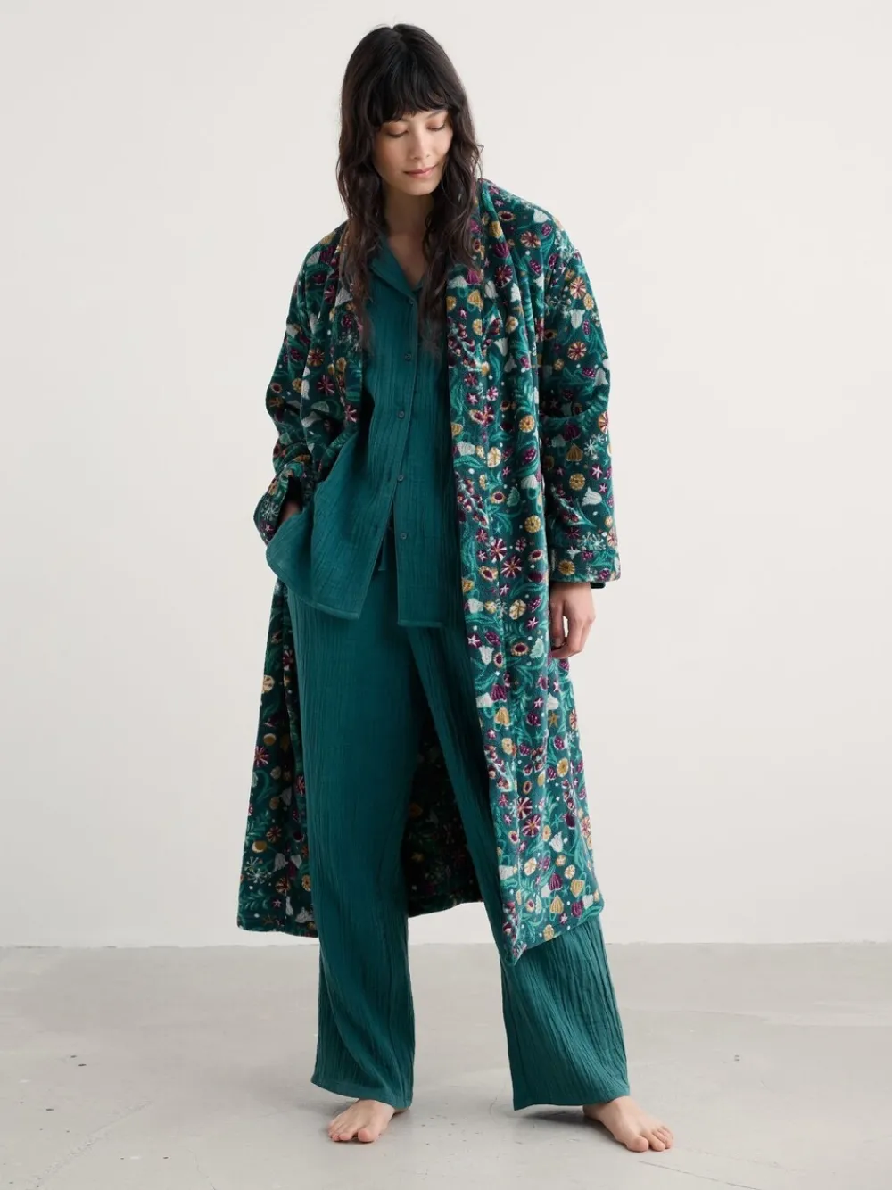 A soft dressing gown made from fluffy recycled polyester and covered with Cornish coastal flowers. Machinewasbaar. 100% polyester.