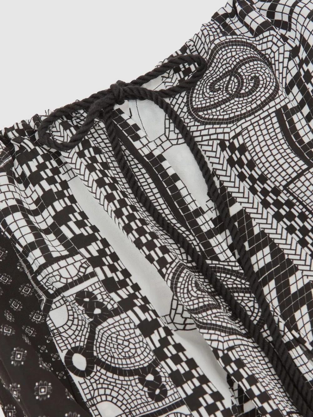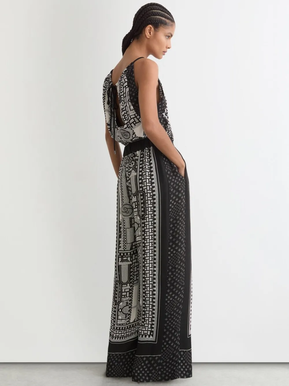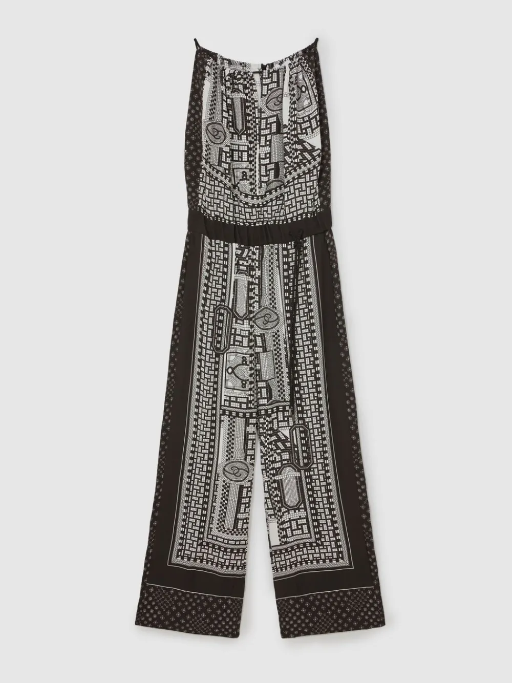 The Inara jumpsuit is patterned with a scarf print and cut to a wide-leg silhouette. Rope-style straps and drawcord ties accent the keyhole neckline and waist. Scarf print Wide leg Tie keyhole neckline Drawcord side-tie waist Sleeveless Side slip pockets Standaard binnenbeenlengte 30,5″/78 cm. Alleen chemisch reinigen. 100% viscose.