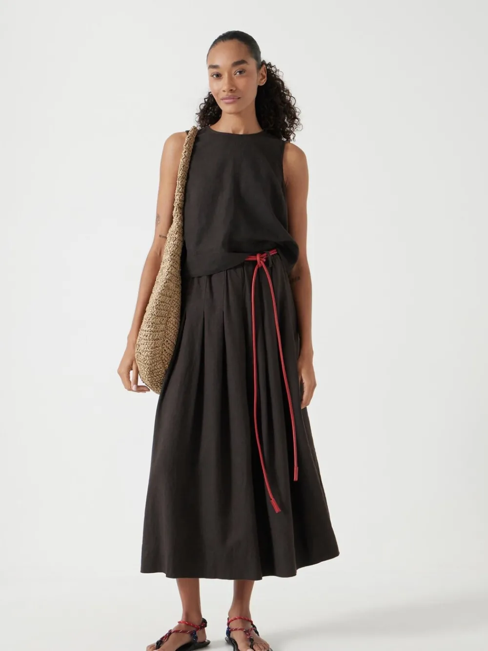 The reason we’ve used so much of our linen-blend fabric this season? It s woven with viscose, so it feels less crunchy and more drapey – demonstrated perfectly by our Ivy midi Light Brown skirt. We’ve stitched pleats in place at the waist to reduce bulk and add lovely swishy volume at the hem, for that effortlessly laid-back look we love. Standaard van tailleband tot zoom 34″ / 86 cm. Machinewasbaar. 52% linnen, 48% viscose.
