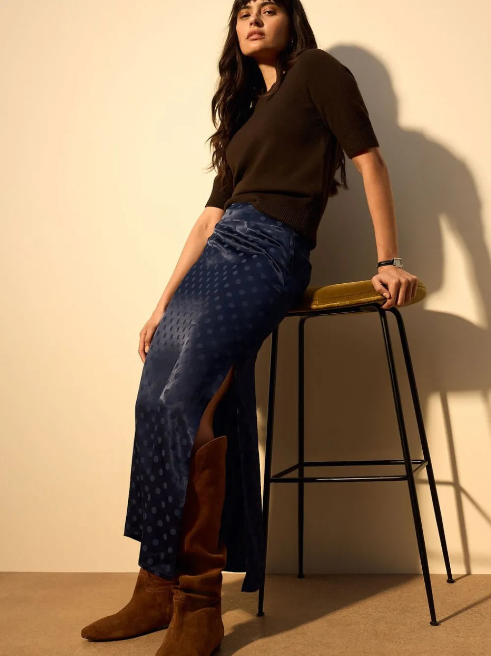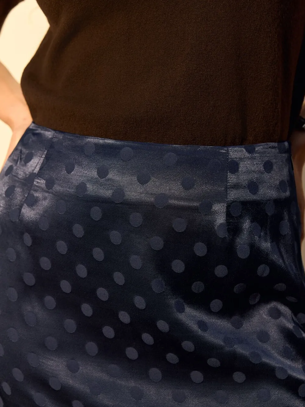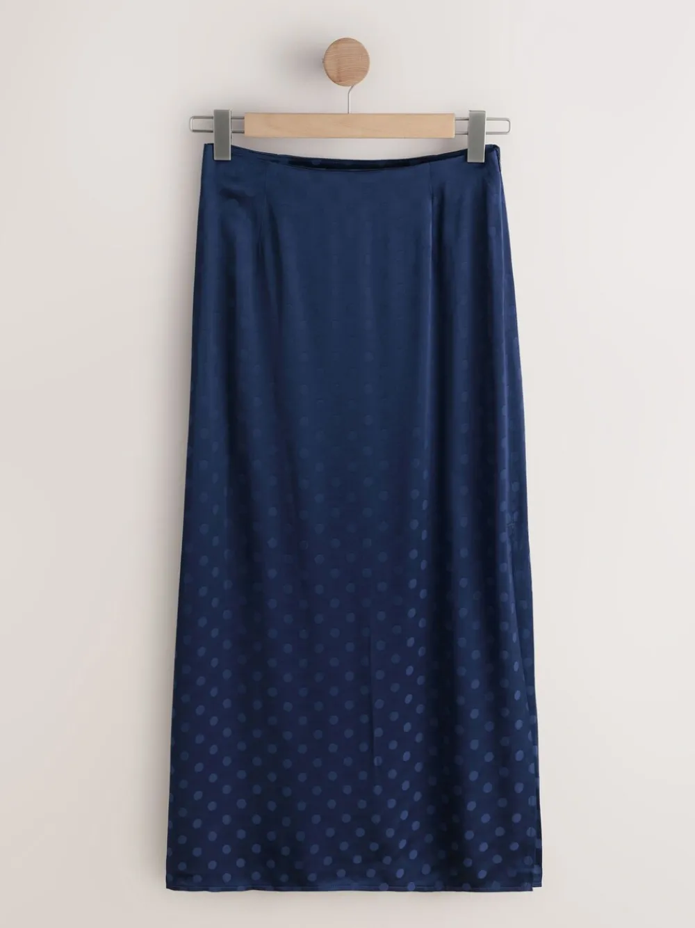 Exude elegance in this sophisticated navy blue maxi skirt, crafted from a luxurious jacquard fabric. The flowy satin material and timeless polka dot pattern create a graceful silhouette, perfect for elevating your day-to-night ensemble. Featuring a discreet back zip, this skirt offers a seamless and polished finish. Polka dot satin Flowy fabric Back zip Maxi skirt Zip fastening Jacquard fabric Standaard van tailleband tot zoom 37″ / 94 cm. Machinewasbaar. 100% LENZING™ ECOVERO™-viscose. Artikelen met het curve-logo zijn verkrijgbaar in de maten 18 en groter.