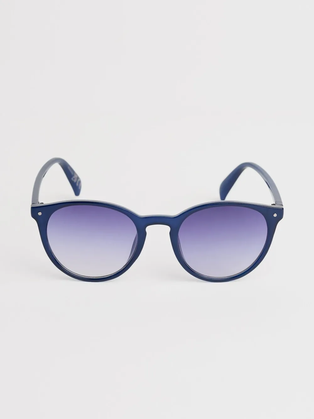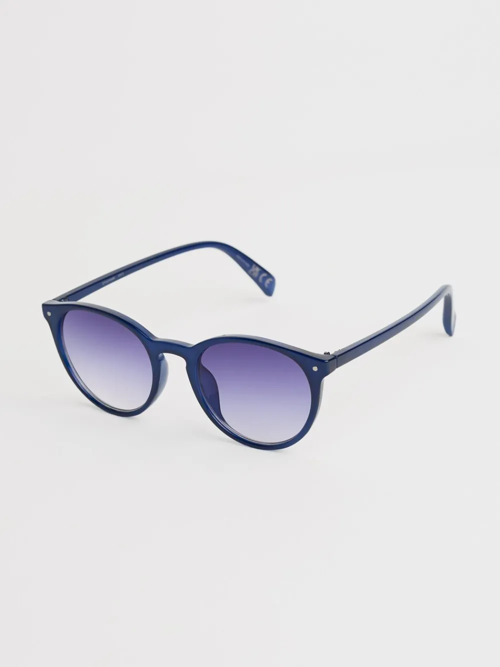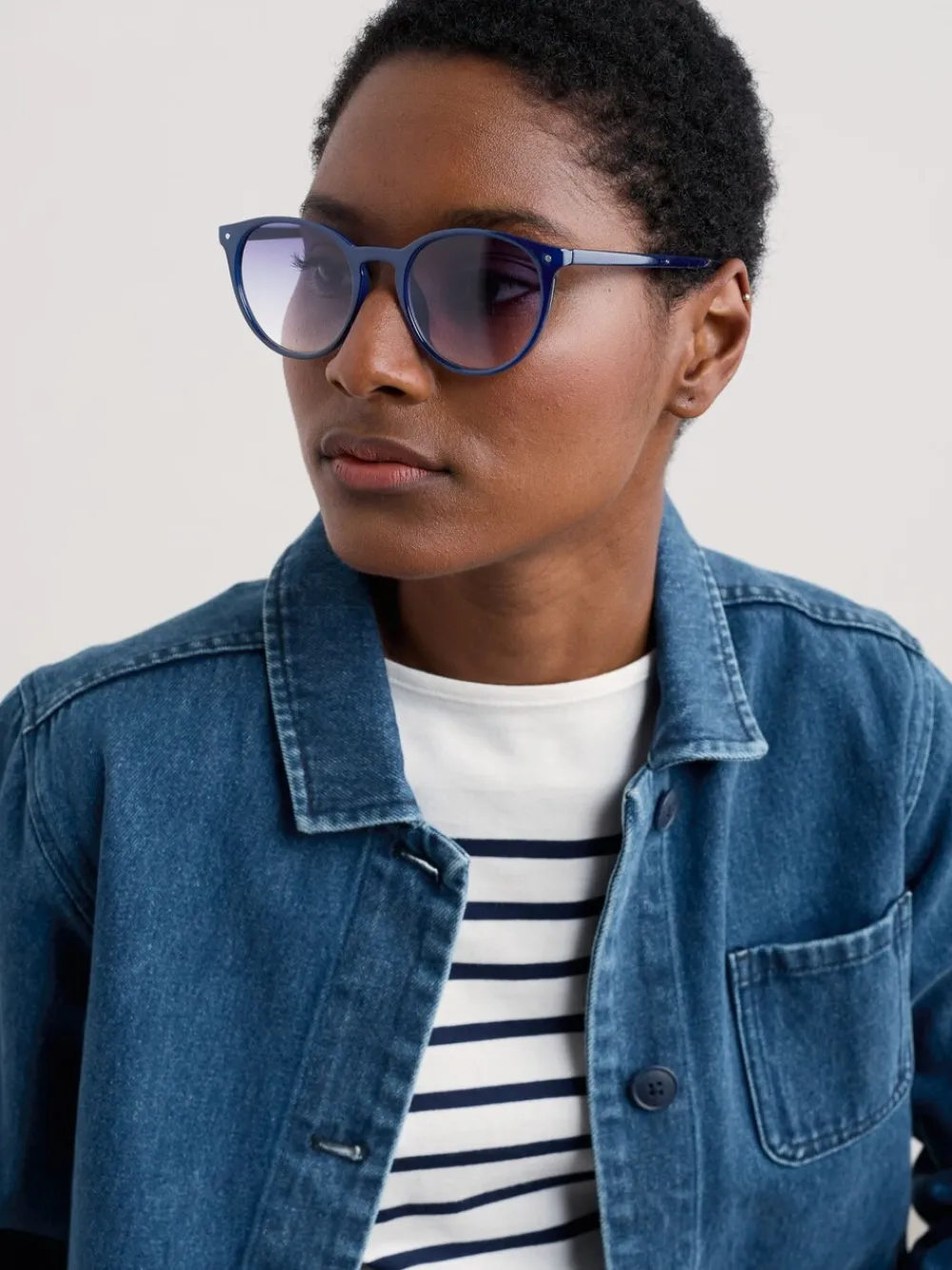 Ronde zonnebril met polycarbonaat montuur, in kleuren geïnspireerd op de zee en de lucht van Cornwall. 90% polycarbonaat, 10% koper.