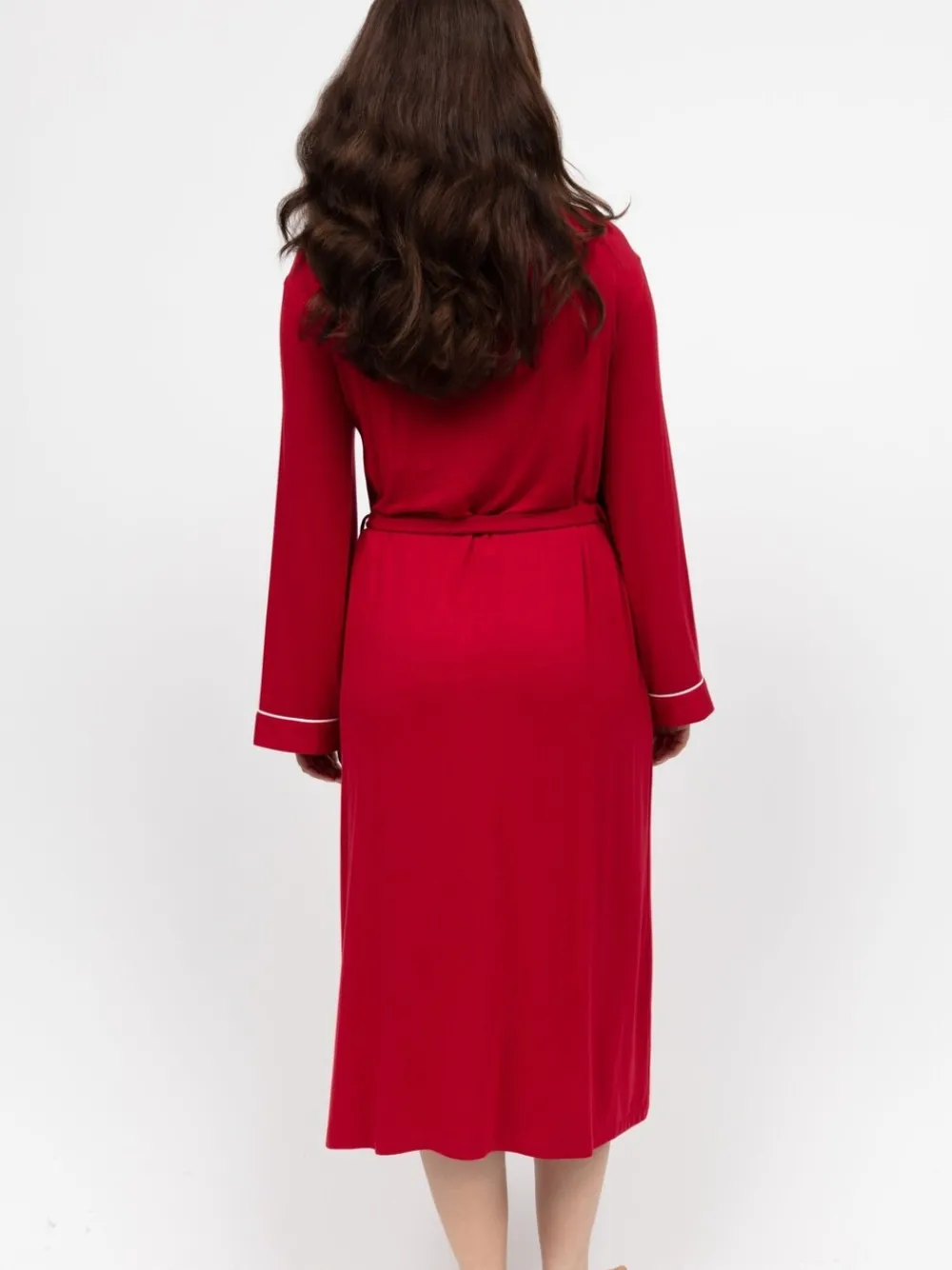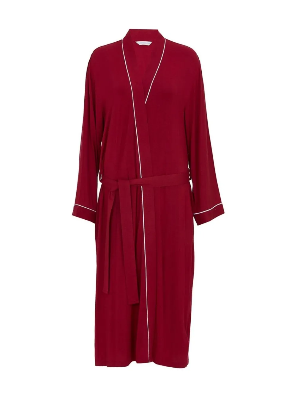 Superb comfort and elegance combine in our long knit dressing gown. Trimmed with colour-contrasting modal for a timeless and exquisite finish, the dressing gown features a wrap-front style that fastens with a self-fabric belt and has two side pockets. Machinewasbaar. 95% modal, 5% elastaan. Waarschuwing: weg houden bij vuur en vlammen.