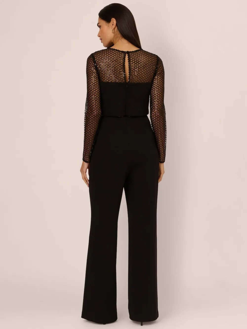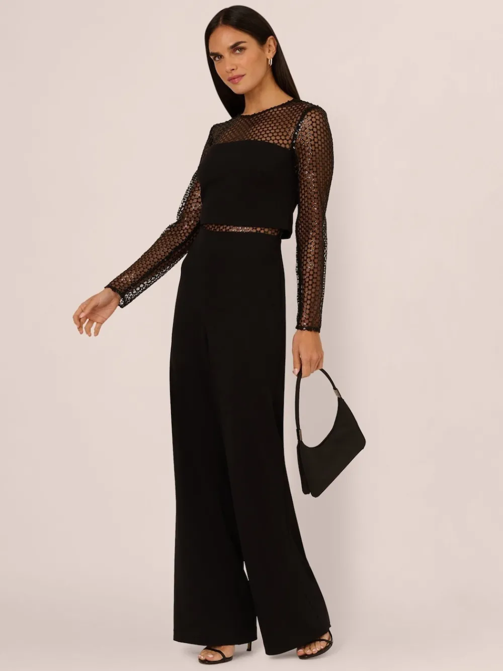 Geef je avondgarderobe een upgrade met deze strakke, zwarte jumpsuit. Het getailleerde lijfje heeft een doorschijnend paillettenpaneel op het middenrif voor een vleugje intrige in een verfijnd ontwerp. Lange mouwen en een doorschijnende halslijn in bijpassende transparante paillettenstof roepen een eigentijdse elegantie op, terwijl de wijde broek het opvallende silhouet compleet maakt. Een verborgen rits aan de achterkant zorgt voor een naadloze afwerking. Deze jumpsuit is perfect voor cocktailparty’s en formele bijeenkomsten en is een stijlvol, modern alternatief voor traditionele jurken. Alleen chemisch reinigen. 95% polyester, 5% elastaan.
