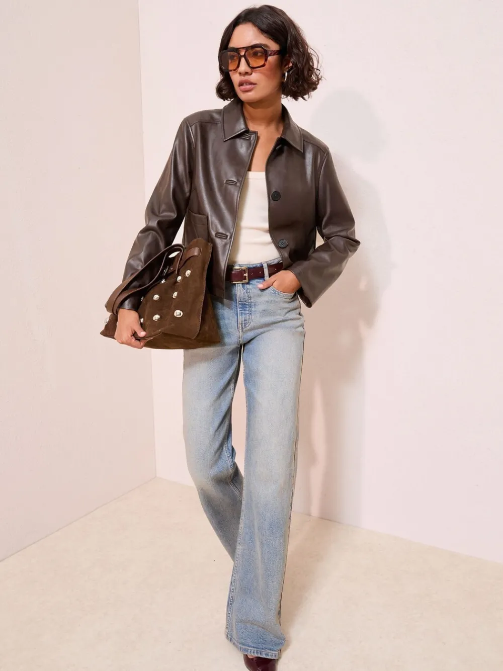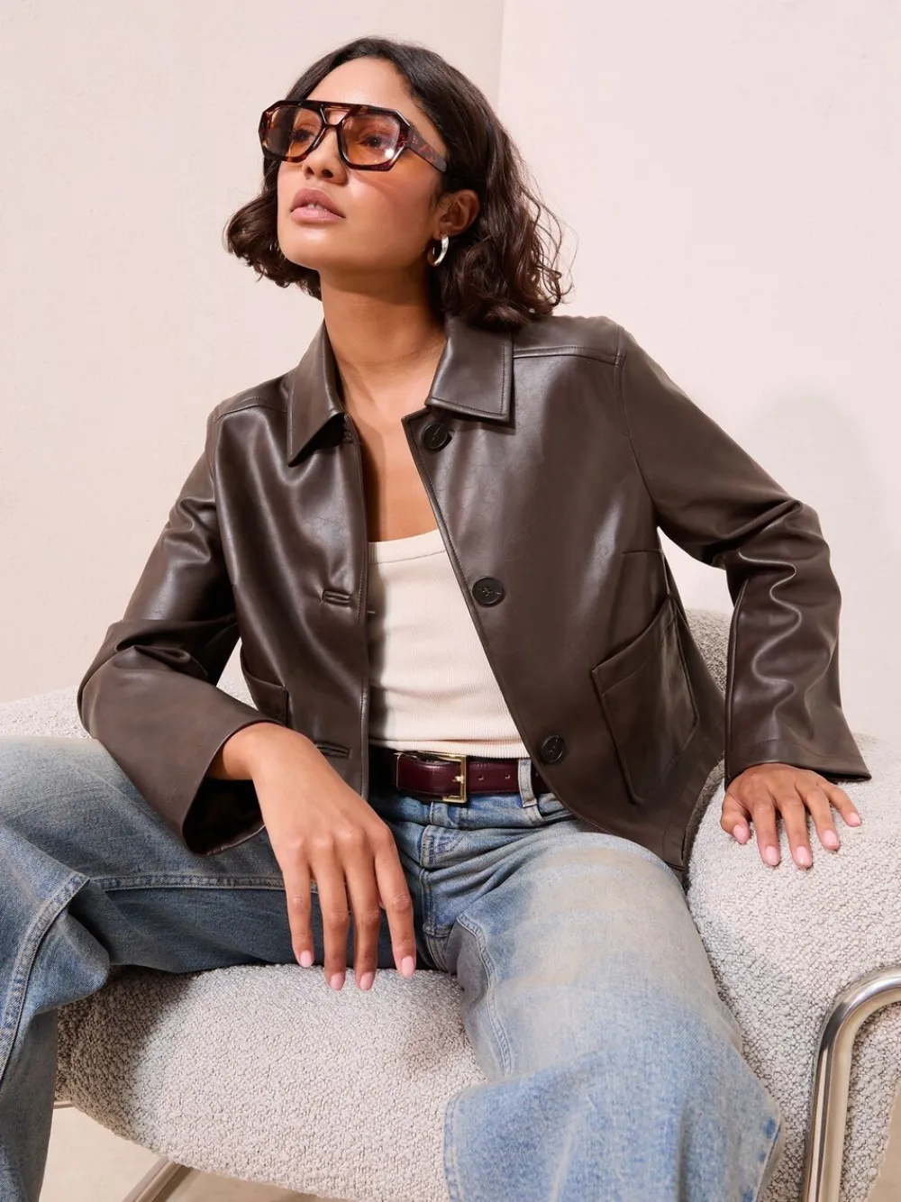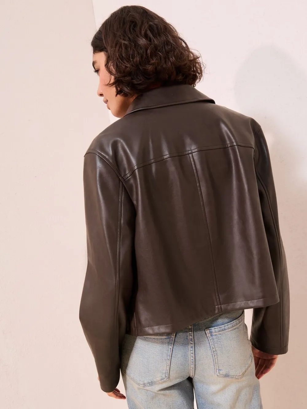 Upgrade your outerwear with this trendy faux leather jacket in a rich brown tone. Designed with a boxy, cropped shape and a smart collar, it’s the perfect transitional piece for versatile layering. Featuring a button front and patch pockets for an effortlessly cool finish. Faux leather fabric Cropped, boxy design Collar and button front Patch pockets Buitenkant 100% polyester met coating van PU. Voering 100% polyester.