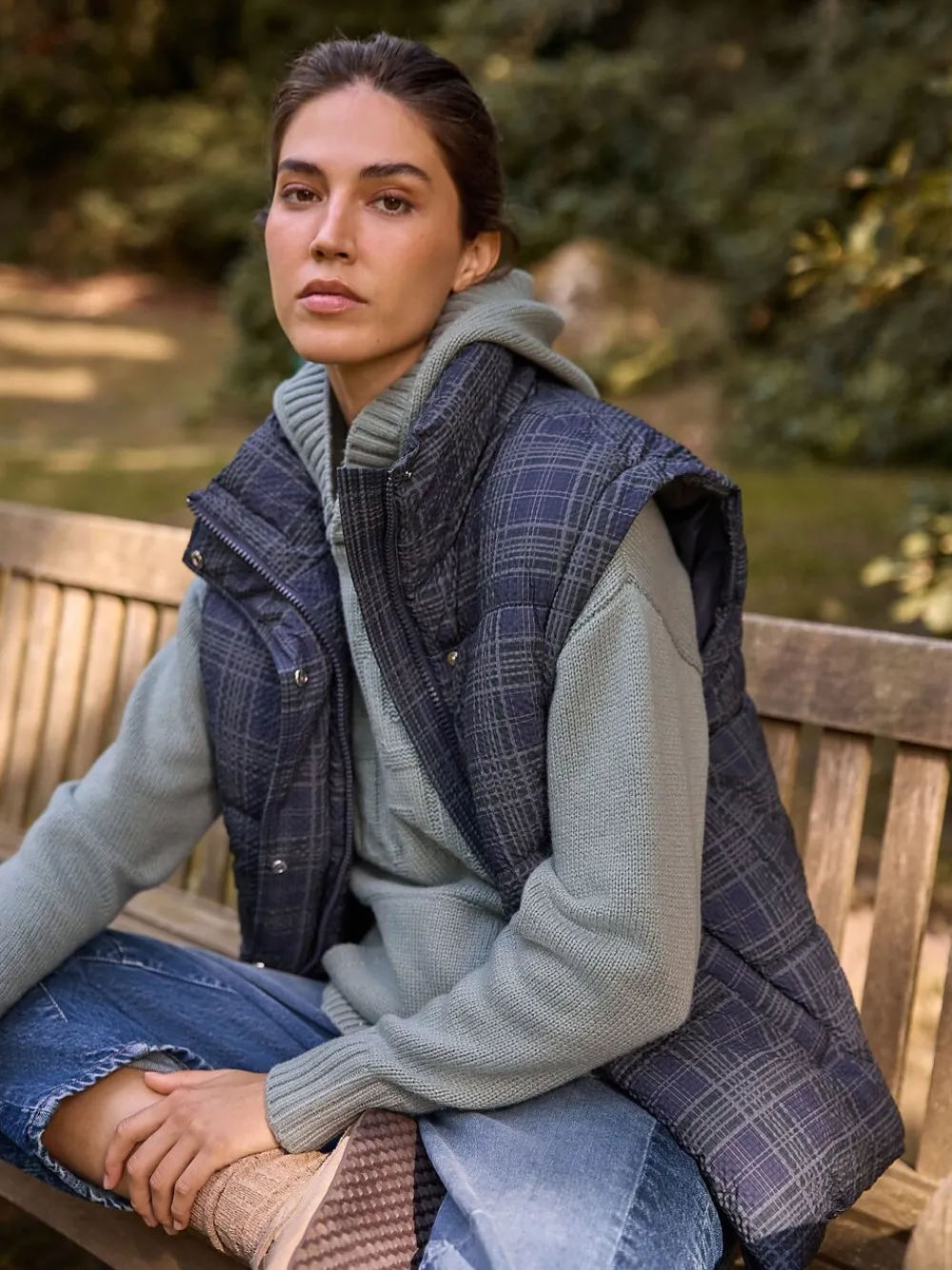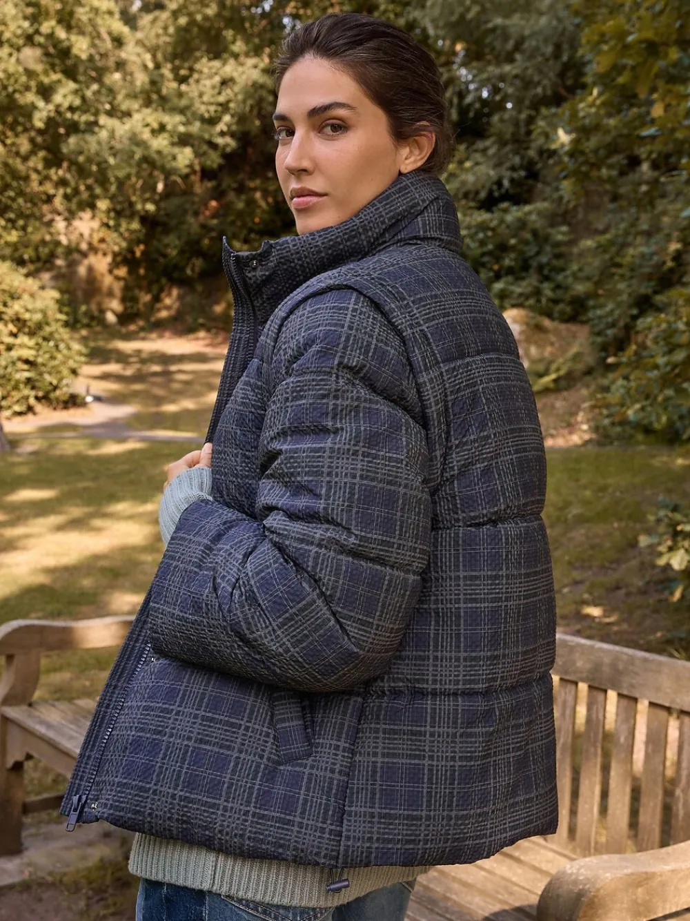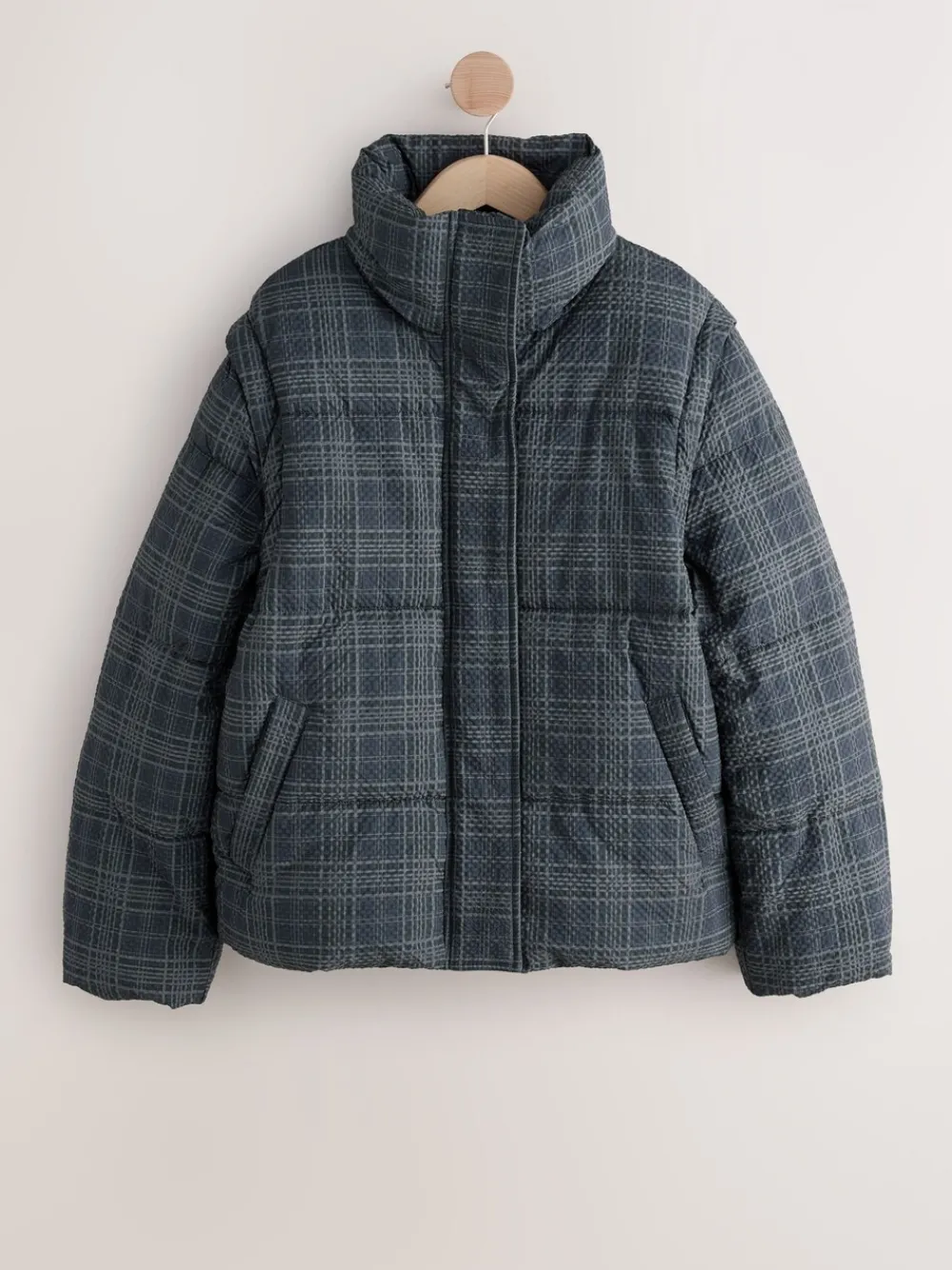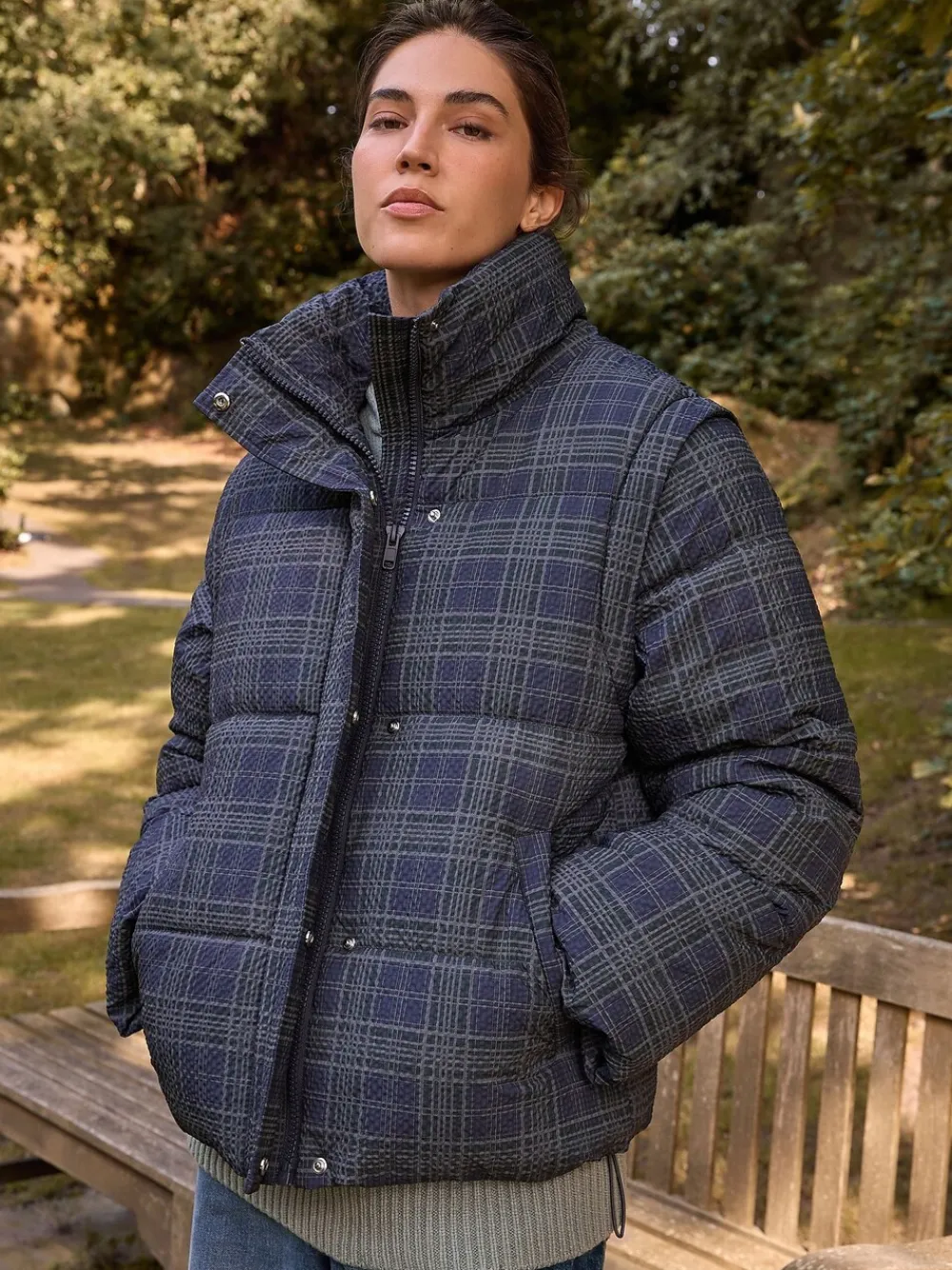 Introducing the ultimate versatile autumn/winter staple: this stylish navy check padded coat. Featuring detachable sleeves, it quickly converts into a chic gilet for transitional weather. The high neck, adjustable hem, and side pockets offer warmth and practicality, secured by a zip and popper fastening. Padded design Navy check print Detachable sleeves Short length High funnel neck Popper and zip fastening Adjustable hem Side pockets Standaardmaat van het midden van de nek tot de zoom 25″ / 64 cm. Machinewasbaar. Buitenkant 100% gerecycled polyester. Voering 100% gerecycled polyester. Vulling 100% gerecycled polyester.