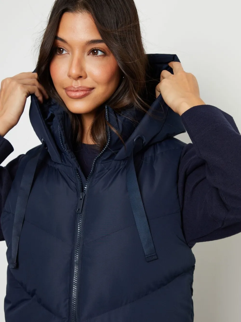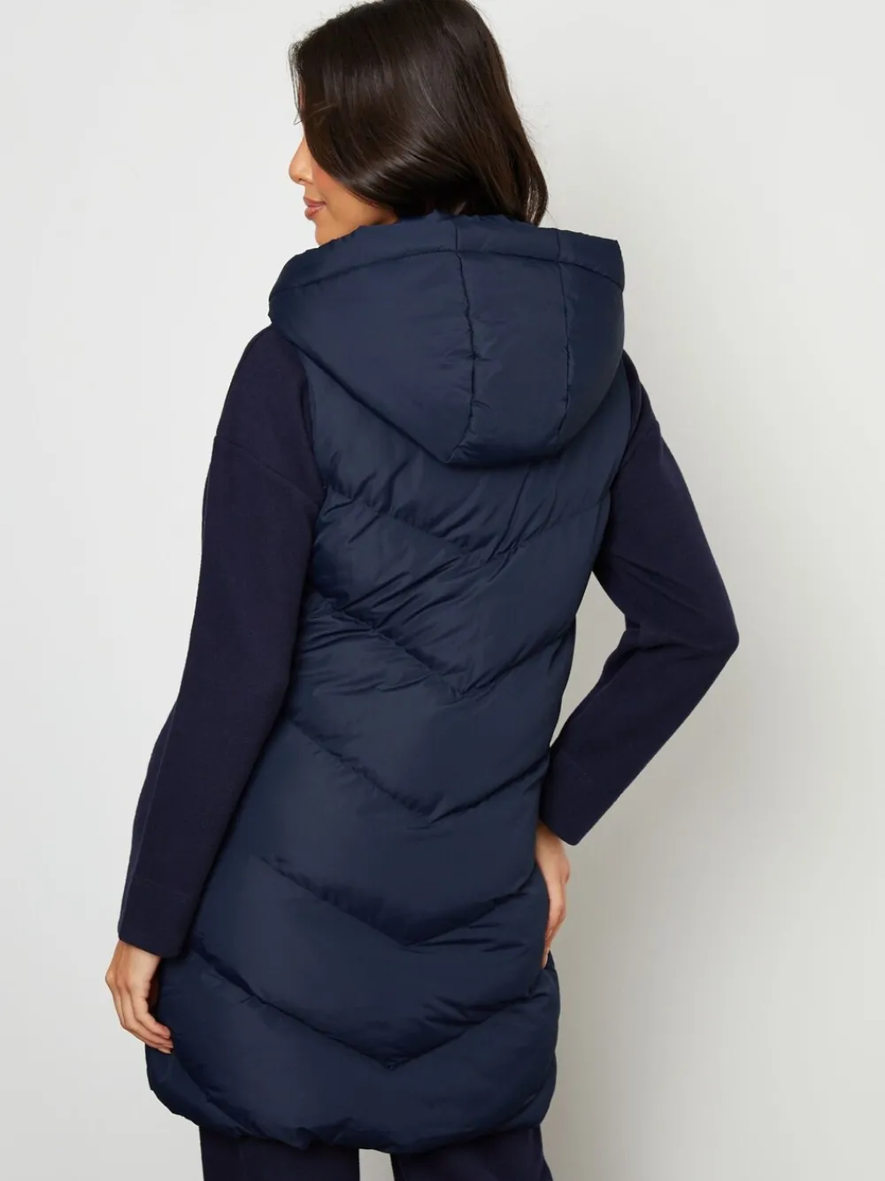 This cosy longline padded gilet from Threadbare is the autumn-winter saviour that s the perfect transition piece to take you into the spring months. Longline length. Chevron quilted padding. Full zip fastening. Oversized hood with drawcords. Sleeveless. Side entry pockets. Model wears UK size 8. Machinewasbaar. 100% polyester.