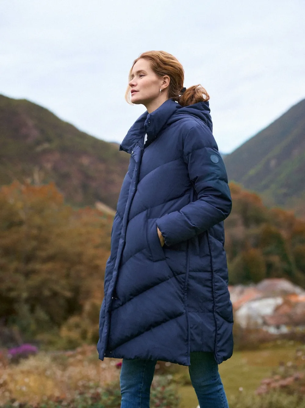 Discrete ritssluitingen aan de zijkant voor extra ruimte. Inritsbaar draagpaneel. Afneembare capuchon met ritssluiting. Ritssluiting aan de voorkant. Gewatteerd chevronontwerp met waterafstotende afwerking. Twee zijzakken. Machinewasbaar. 100% polyester.