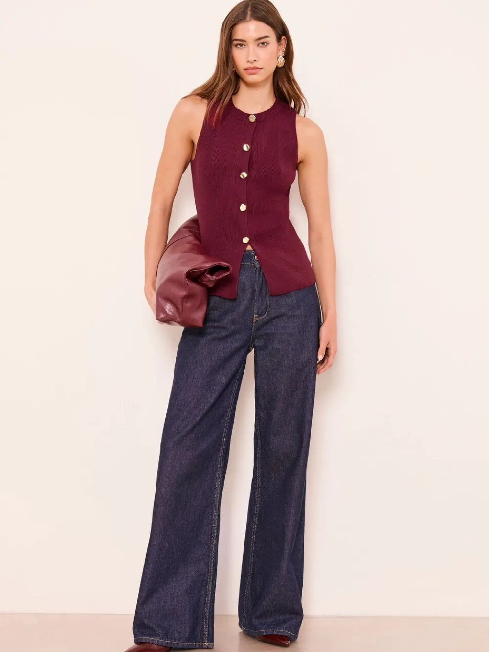 Achieve effortless sophistication with this chic ribbed knitted waistcoat by Lipsy, perfect for layering during transitional weather. The longline, sleeveless silhouette features prominent gold button detailing for an elevated finish. Wear this versatile piece fastened or open over shirts and blouses for a smart-casual ensemble. Knitted sleeveless waistcoat Longline silhouette Ribbed knit fabric Gold button up detail The model wears a size 8, and the wearing length from the side neck to the hem is 62cm. 63% polyester, 37% katoen.