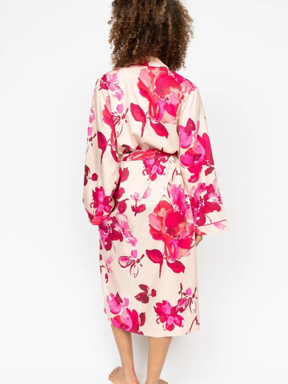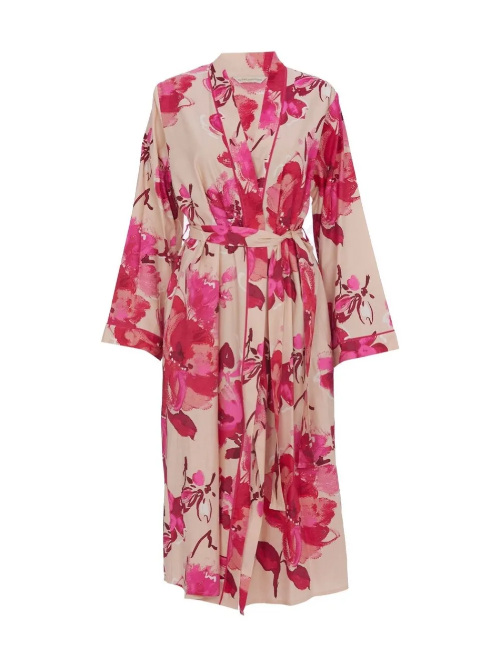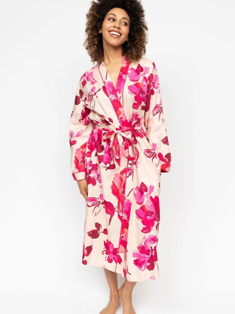 Creëer glamour bij het slapengaan met de lange Cyberjammies kamerjas met print. Gemaakt van heerlijk zacht 60% katoen, 40% modal, de bovenkant is afgezet met contrasterend modal. De kamerjas heeft een wikkelmodel in kimonostijl en wordt aan de voorkant gesloten met een riem van dezelfde stof. De kamerjas heeft twee zakken aan de zijkanten. Machinewasbaar. 60% katoen, 40% modal. Waarschuwing: weg houden bij vuur en vlammen.