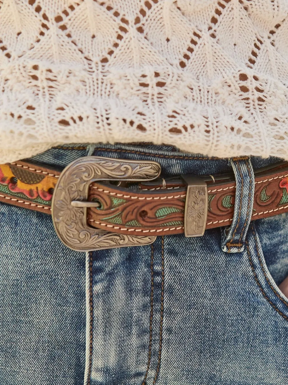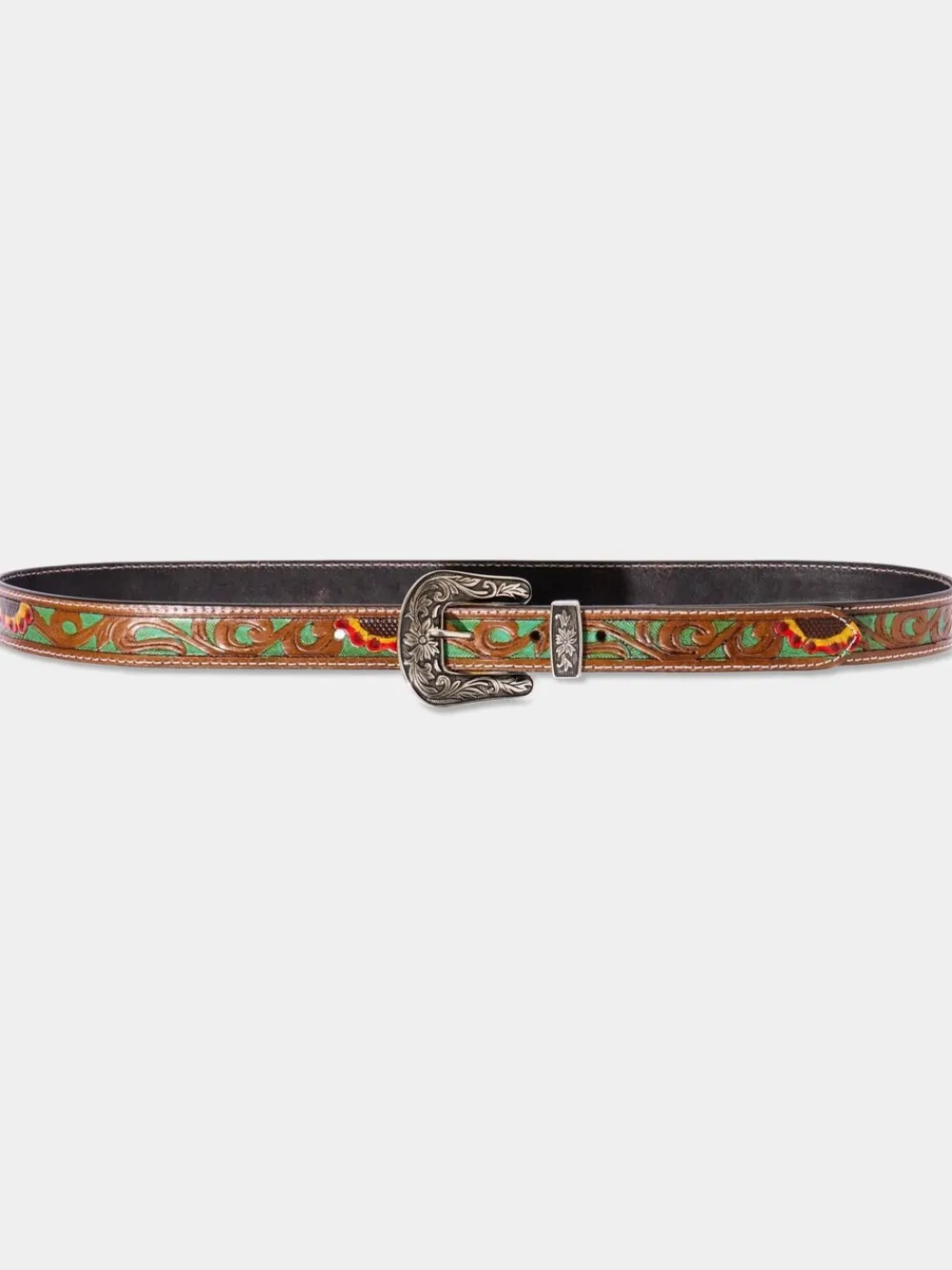 Deze riem in westernstijl transformeert uw favoriete jeans in een handomdraai. Het karakter komt voort uit de verwassen gesp, de gelaserde details en de turquoise accenten. Ze geven uw dagelijkse outfits een stijlvolle finishing touch. Een makkelijk te dragen accessoire dat u seizoen na seizoen kunt gebruiken. Waarom niet helemaal losgaan met cowboy Boots en een hoed met brede rand? 100% leer.
