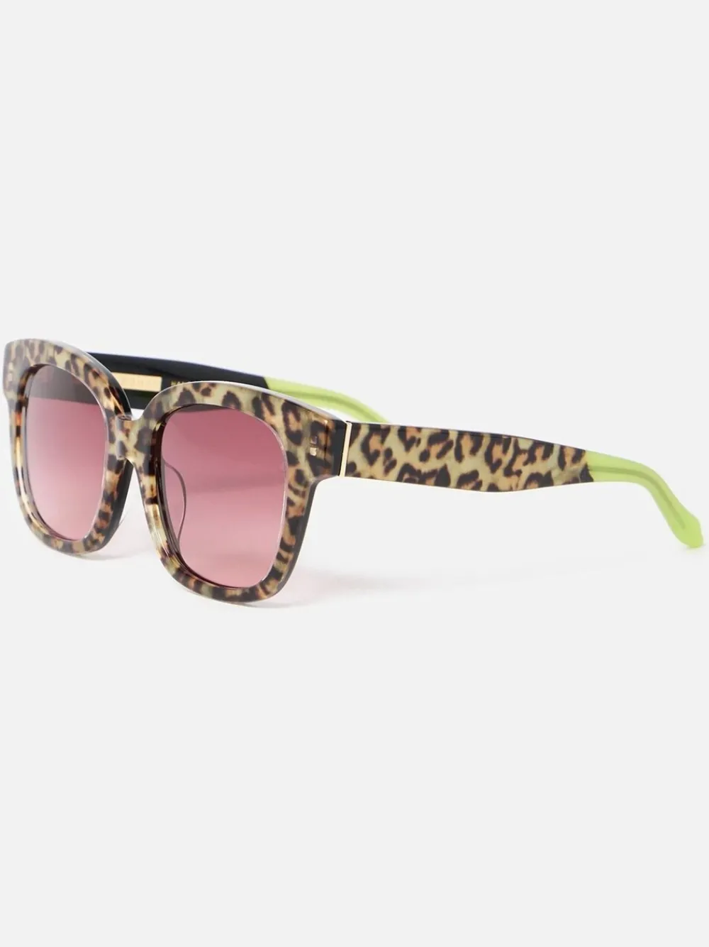 Vierkante zonnebril van acetaat met donkerroze glazen, een montuur met luipaardprint in tonale bruin en groen en bijpassende pootjes met een lichtgroene punt. 100% acetaat.