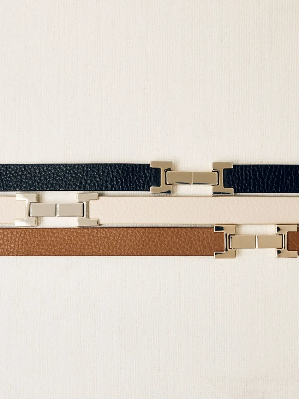 The Tan Hayley belt in stone is crafted from premium leather and it features statement gold-tone detailing that will elevate any look. 100% leather Slim design Gold-tone metal hardware Square-hinge fastening Breedte 2,5 cm 100% leer.