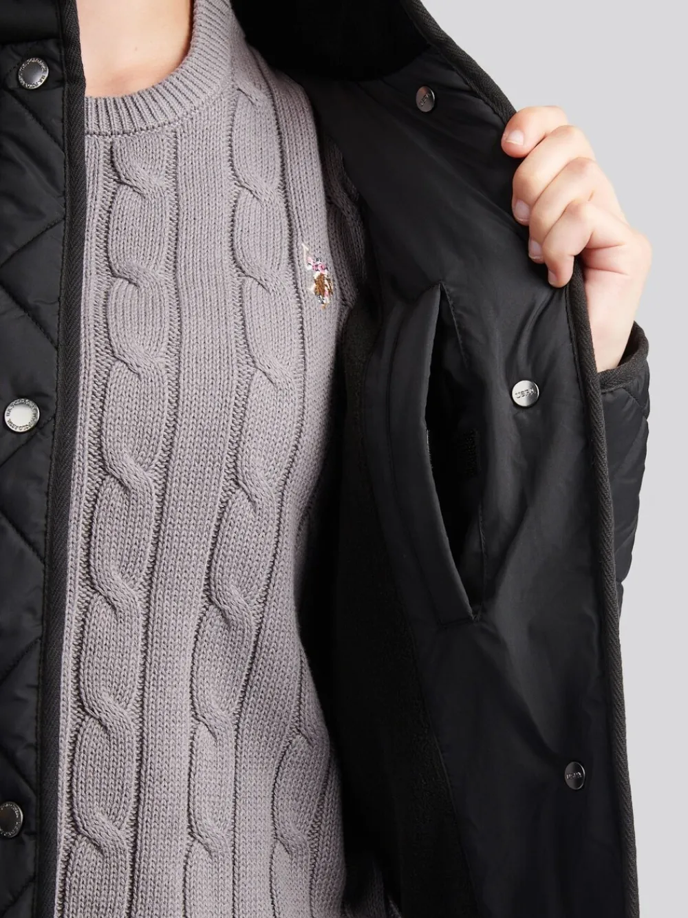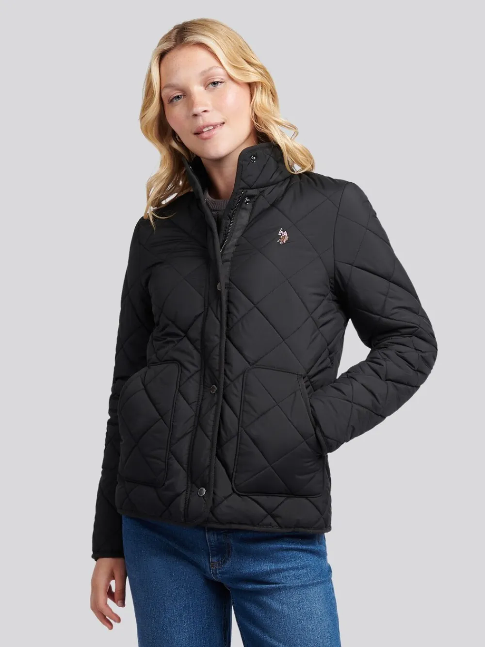 This lightweight quilted jacket from U.S. Polo Assn. is a go-to layer for transitional weather, whether you’re running errands or heading out of town. Crafted from a water-resistant shell with soft polar fleece lining, it offers warmth without the bulk. The adjustable waist tabs help shape the silhouette, while a corduroy-trimmed funnel neck, branded hardware and front patch pockets lend extra charm. Thoughtful details such as internal grosgrain binding and a diamond quilted finish reflect the brand’s commitment to quality and timeless style. Machinewasbaar. 100% polyester.