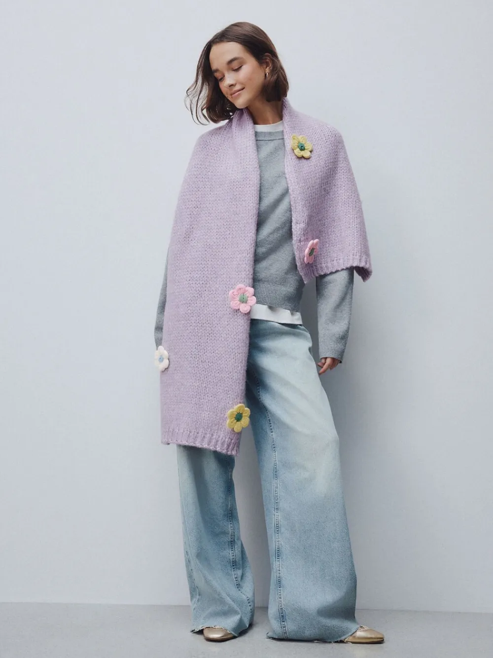 Wrap up warm with this charming lilac hand-knit scarf. The cosy, heavyweight base is beautifully decorated with playful, colourful hand-knit flower details, perfect for adding a fun and cheerful touch to any winter outfit. Handknit flower detail Heavyweight knit Lilac ground colour 50% acryl, 41% polyester, 9% nylon.