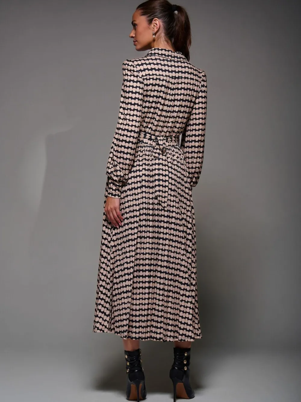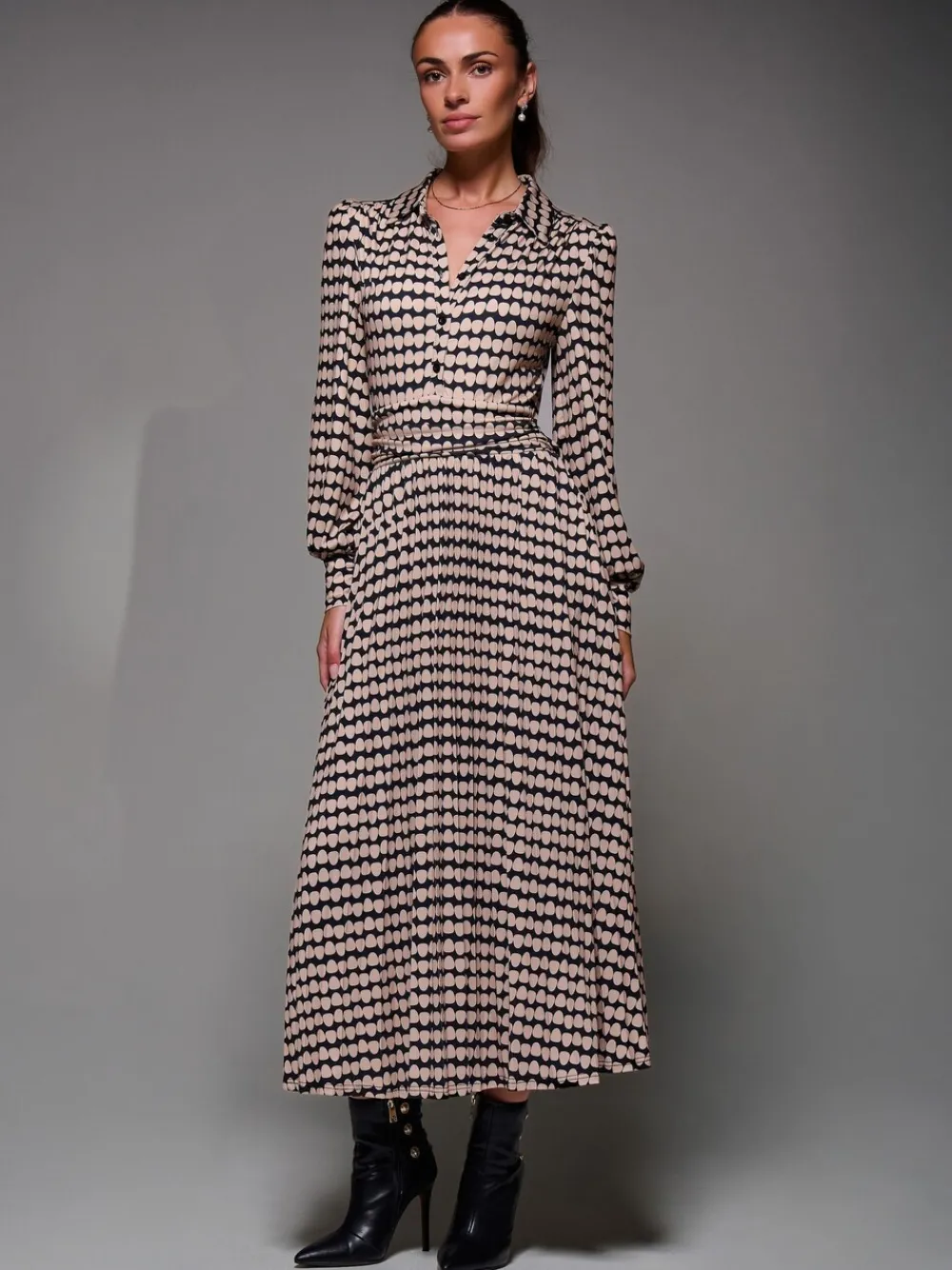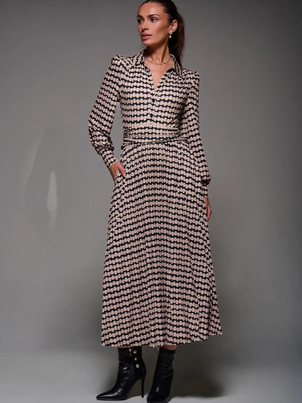 The Long Sleeve Pleated Jersey Maxi Dress by Jolie Moi. Made from soft jersey fabric, this maxi-length dress features a button-up shirt design with a structured collar neckline. It has cuffed long sleeves and a flowing pleated skirt for graceful movement. Fully lined, the dress also includes a tie detail at the back to cinch the waist, along with two discreet side pockets for practicality. Machinewasbaar. 94% polyester, 6% elastaan.