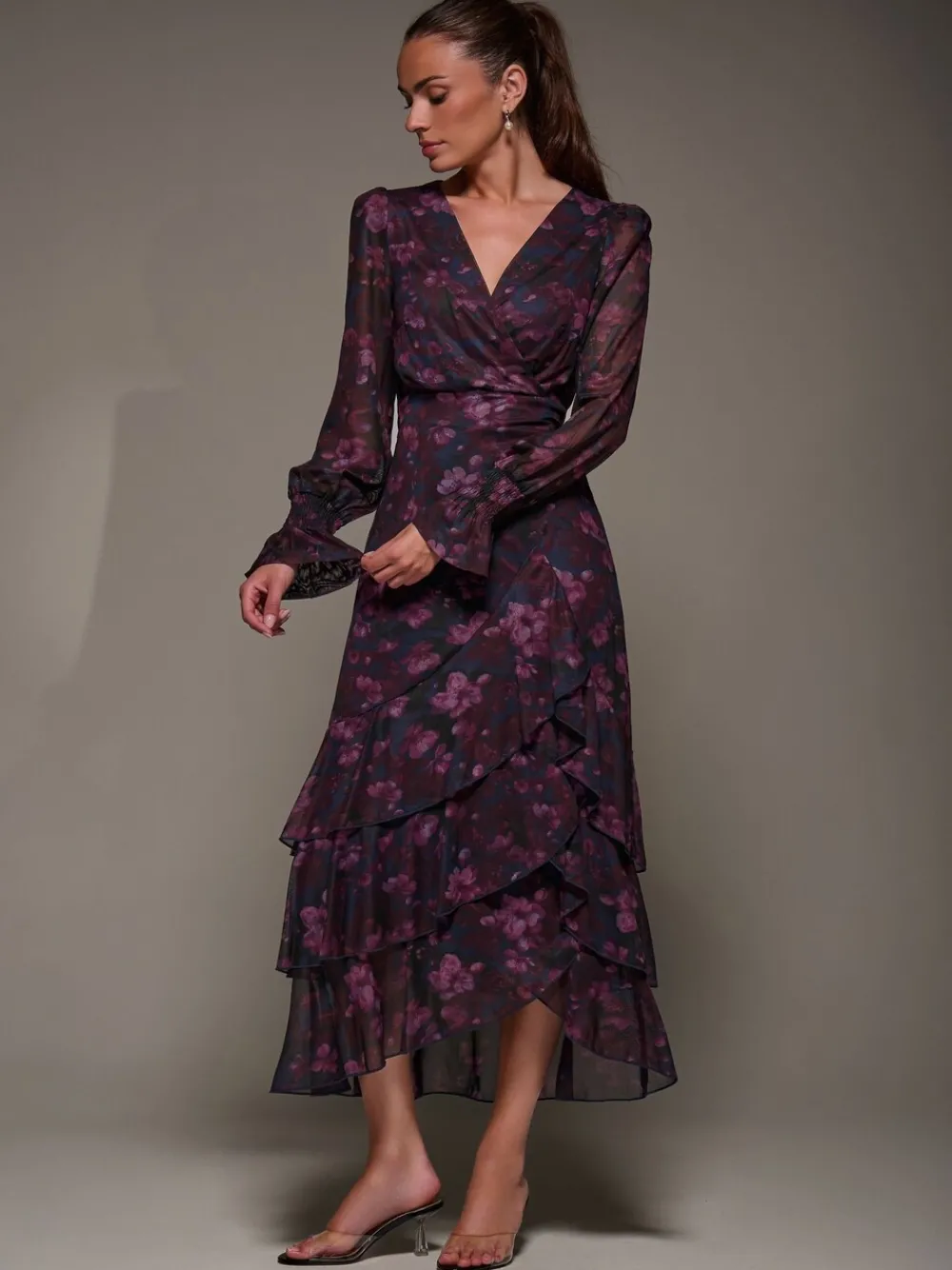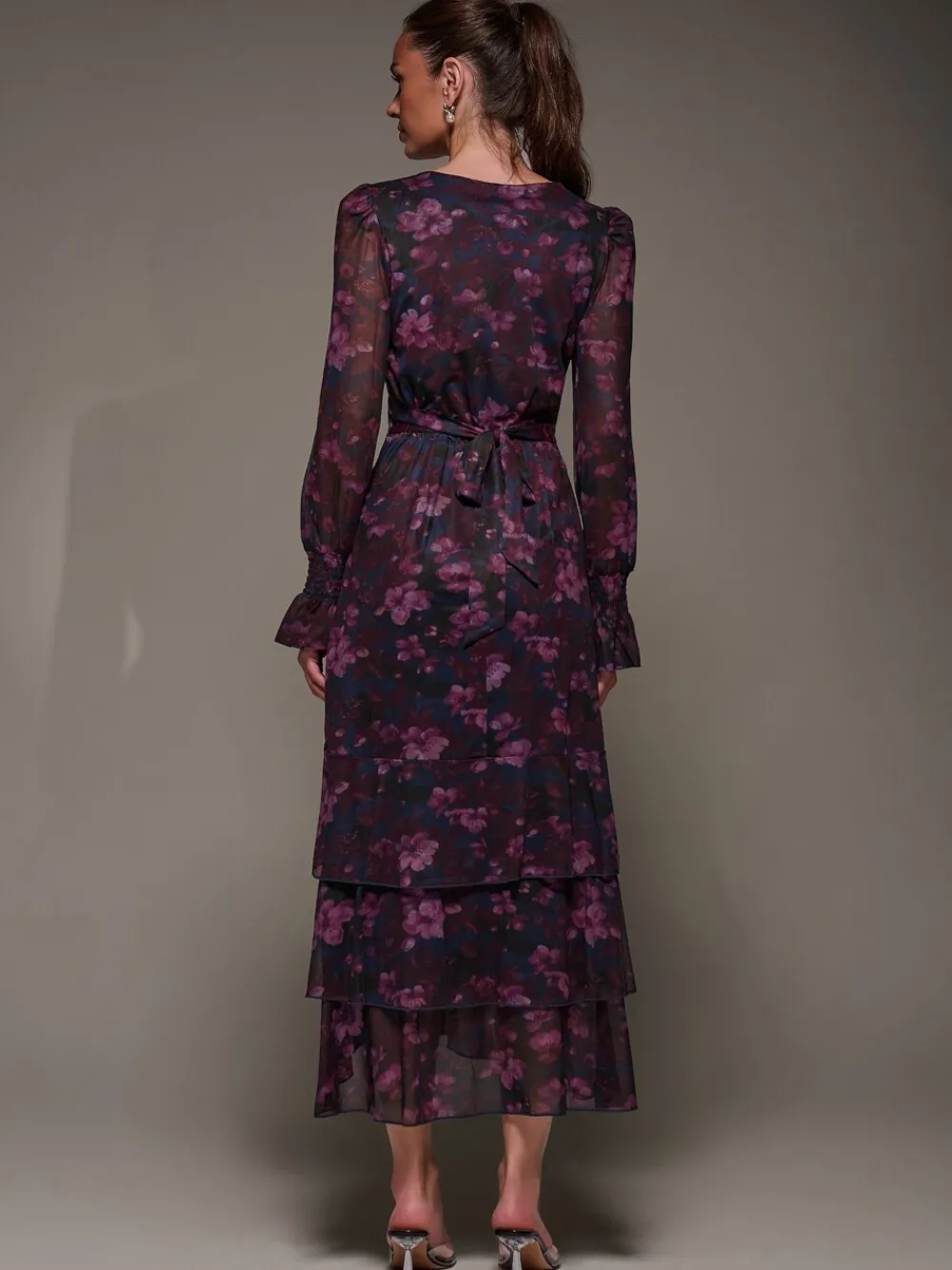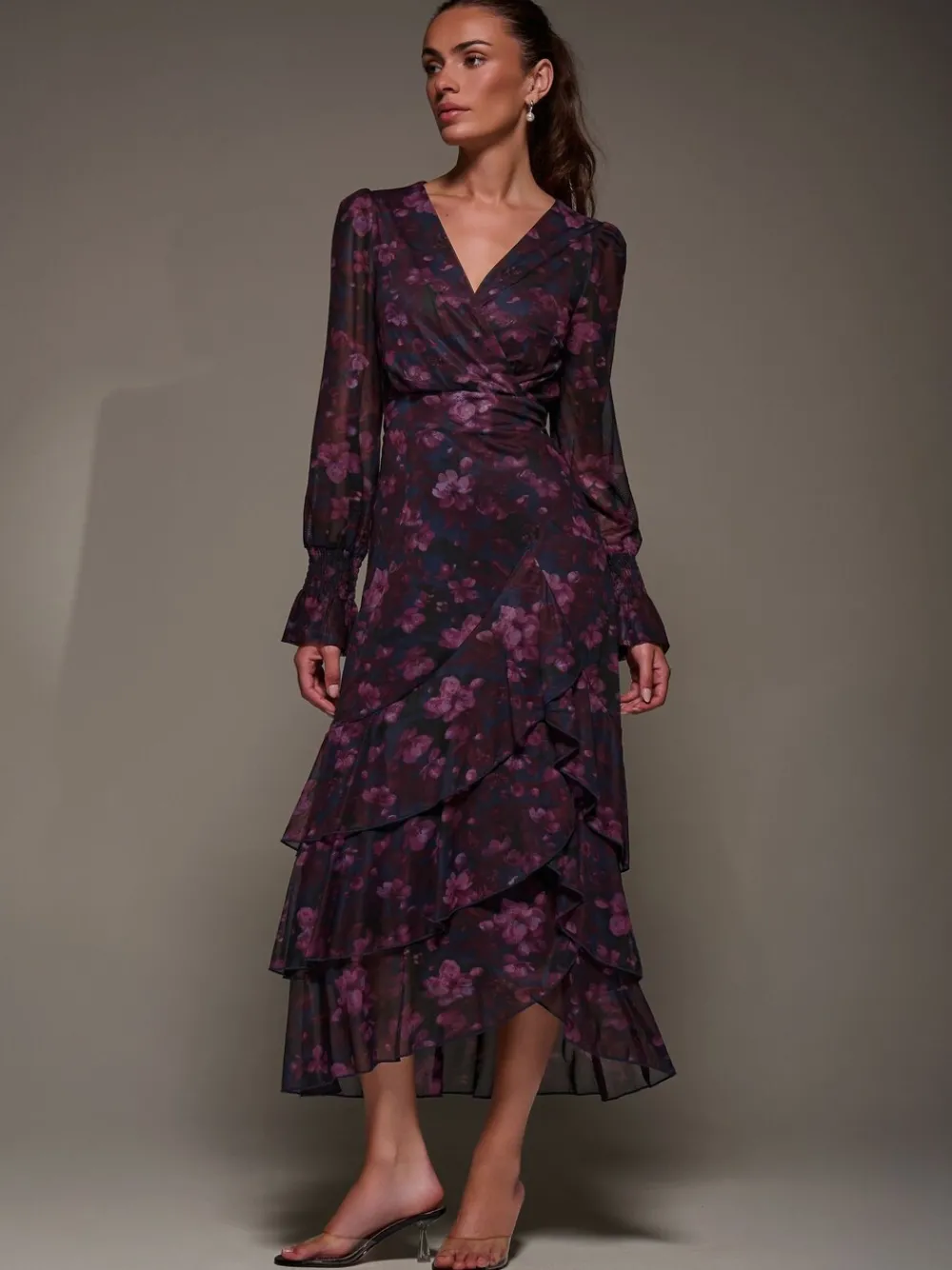 Long Sleeve Ruffle Hem Mesh Maxi Dress by Jolie Moi features long sleeves with shirred wrists that naturally flare out. The V-Neckline and wrap-style front enhance the flattering silhouette, while the belt cinches the waist. The three-tiered ruffle hemline is slightly shorter in the front so the dress sways beautifully as you walk. Machinewasbaar. 95% polyester, 5% elastaan.