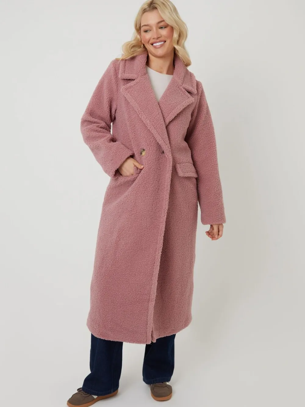 Elevate your winter wardrobe with this longline double-breasted formal borg coat from Threadbare. Soft borg fabric. Boxy fit. Longline length. Large revere collar. Double-breasted mock horn button-up fastening. Two front flap pockets. Machinewasbaar. 100% polyester.