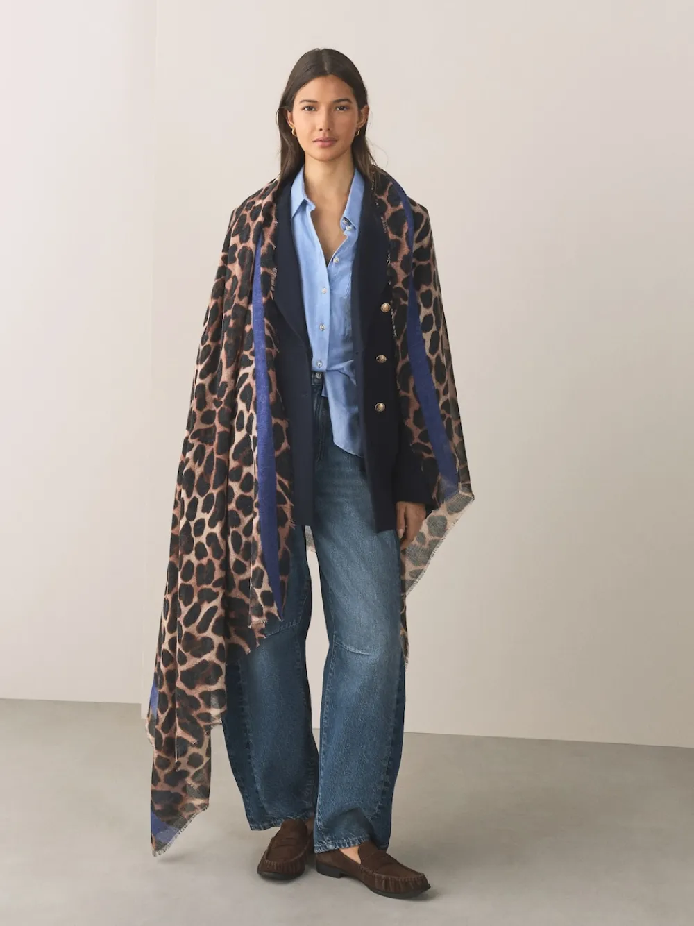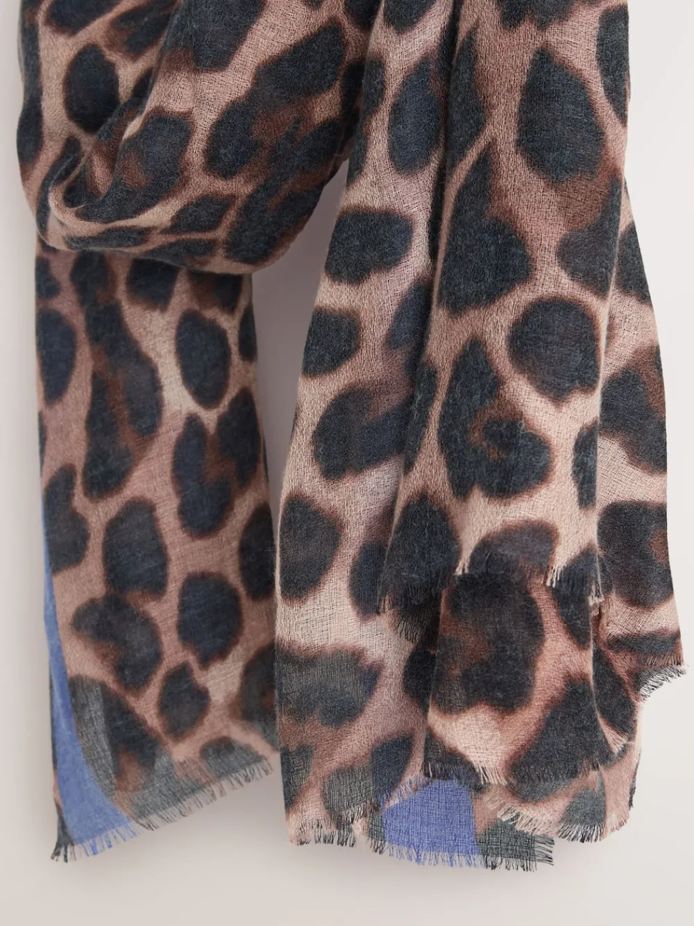Add a bold, stylish flourish to any outfit with this leopard print scarf. Crafted from a soft, lightweight fabric, it is comfortable for year-round wear and perfect for layering. The striking print features hints of blue at the border, adding an unexpected, chic element to this statement accessory. Leopard print design Lightweight soft fabric Versatile accessory Fringed edge Subtle blue colour detailing Ideal for layering Lengte 180 cm Breedte 70 cm 80% acryl, 20% wol.