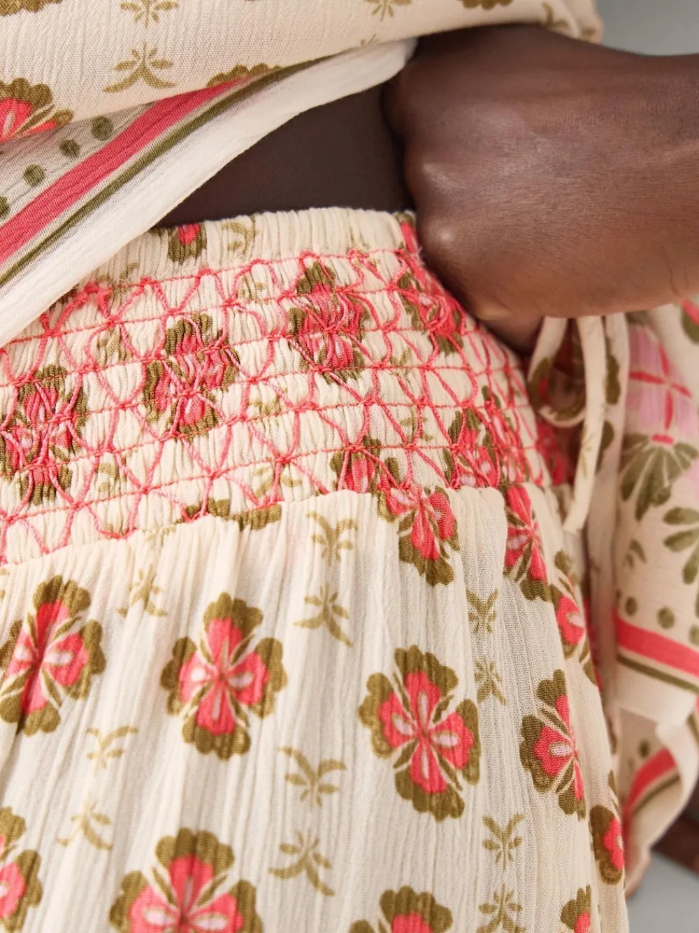 Prints charming. Calling for balmy days in warmer climates, these trousers are a real suitcase staple if you re escaping to get some winter sun. Designed in lightweight viscose with a subtle crinkled texture, they re patterned with ornate florals and dot work in a mix of pink and khaki tones. Looking to create a playful co-ordinated look packed with personality? Don t forget the matching cami top. Machinewasbaar. 100% viscose.