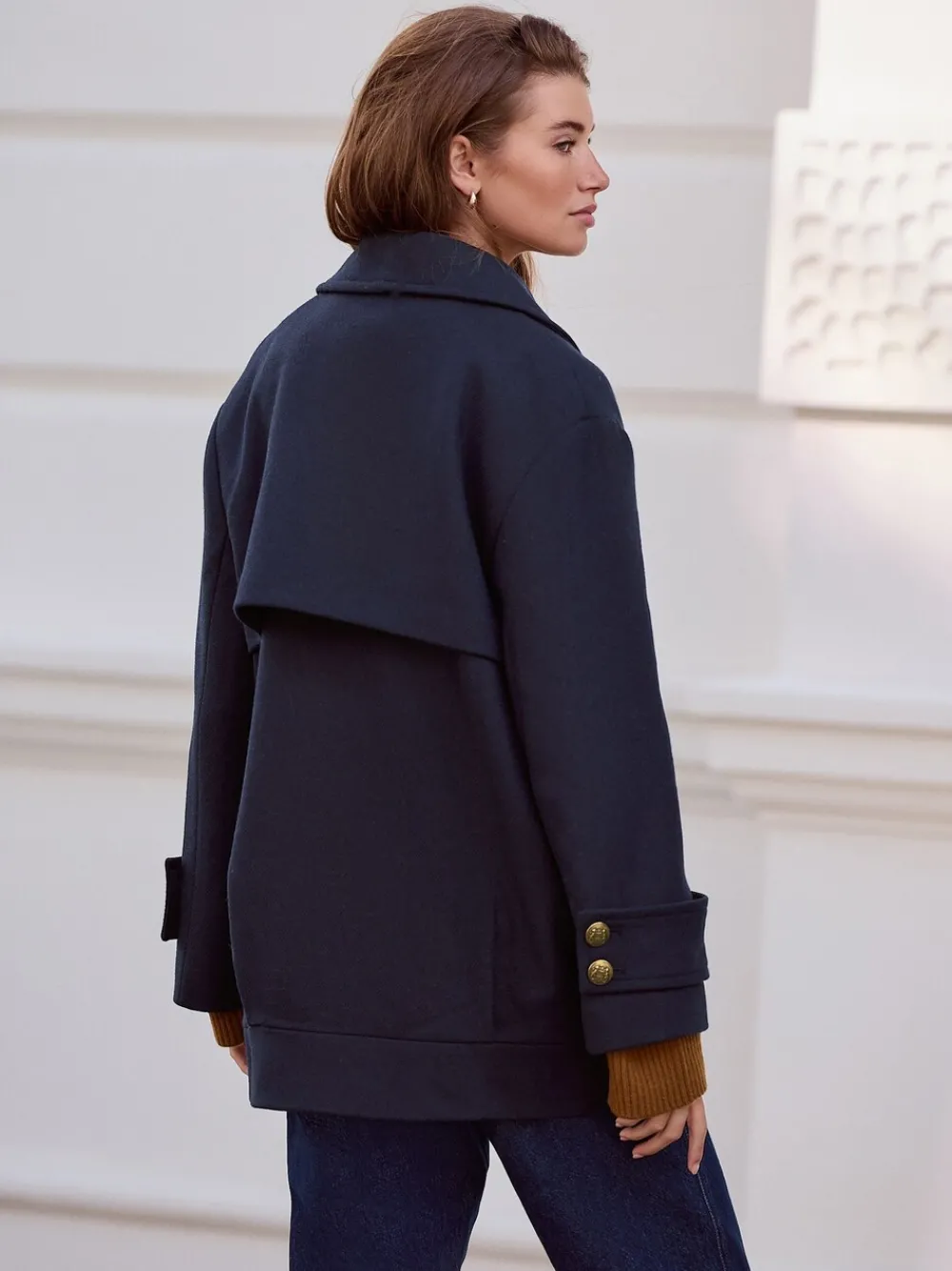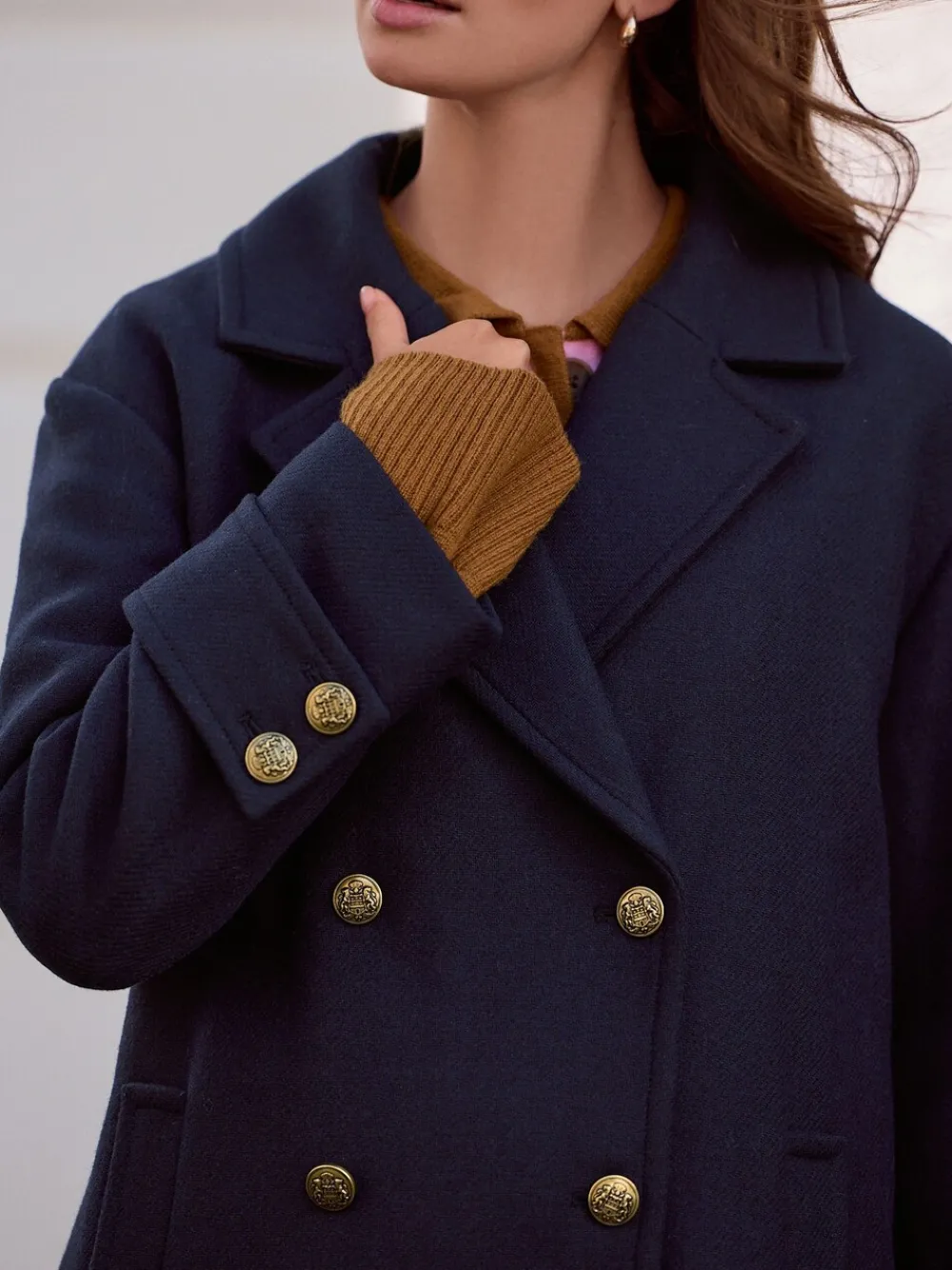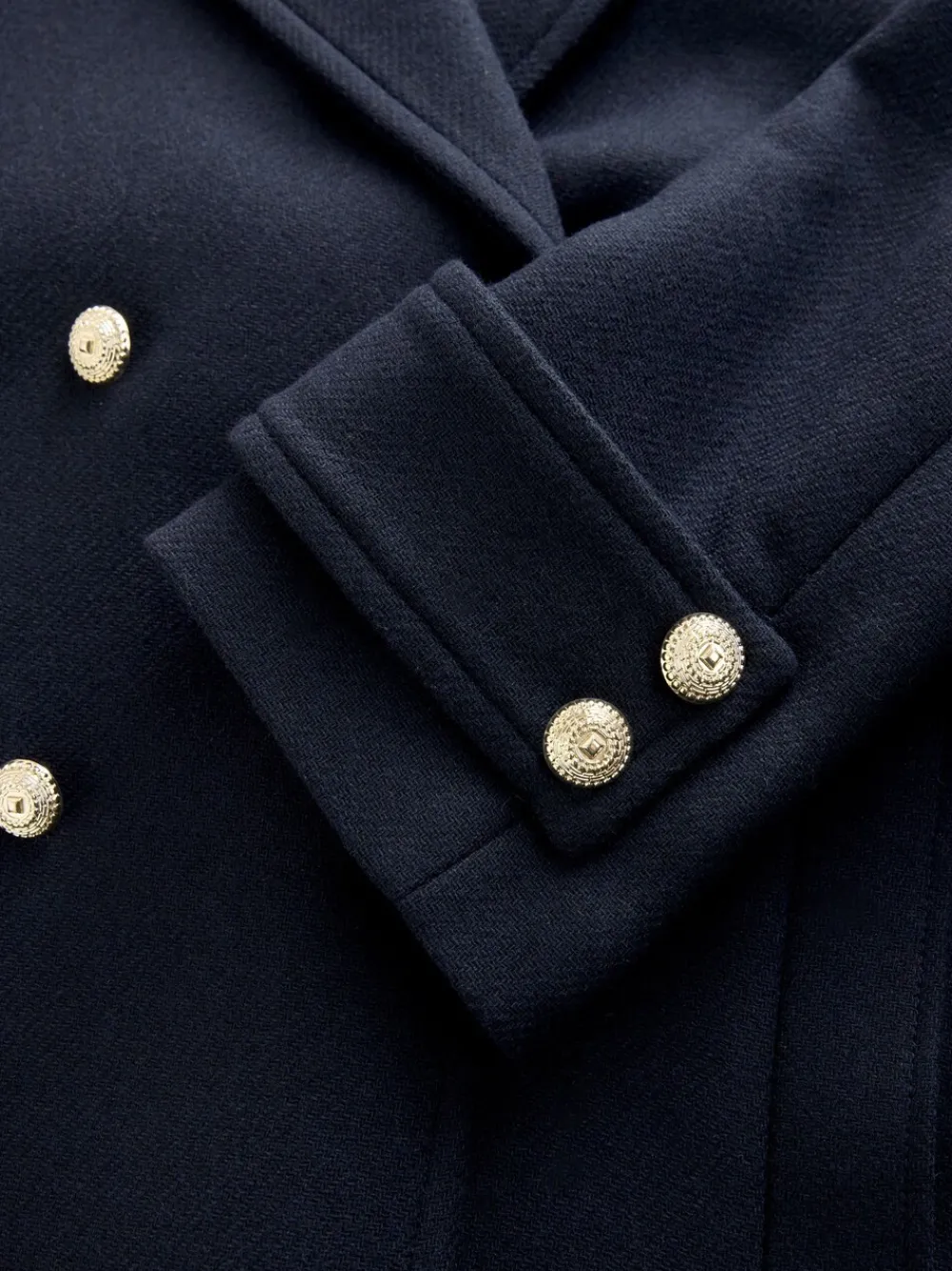 Embrace timeless military style with this premium navy pea coat. Featuring a classic double-breasted design with striking gold-tone buttons and wide lapels, this wool-blend piece is perfect for chic, warm layering this season. Contains wool Double breasted Military style buttons Wide lapel collar Front pockets Standaard van het midden van de nek tot de zoom 30.5″ / 78 cm. Door gespecialiseerde stomerij laten reinigen Buitenkant 46% wol, 34% polyester, 15% acryl, 4% nylon, 1% viscose. Voering 100% polyester.