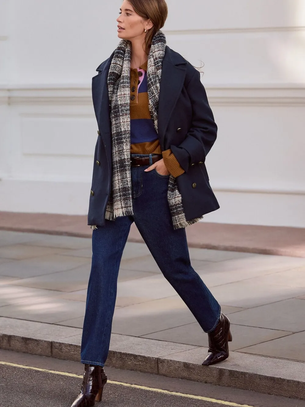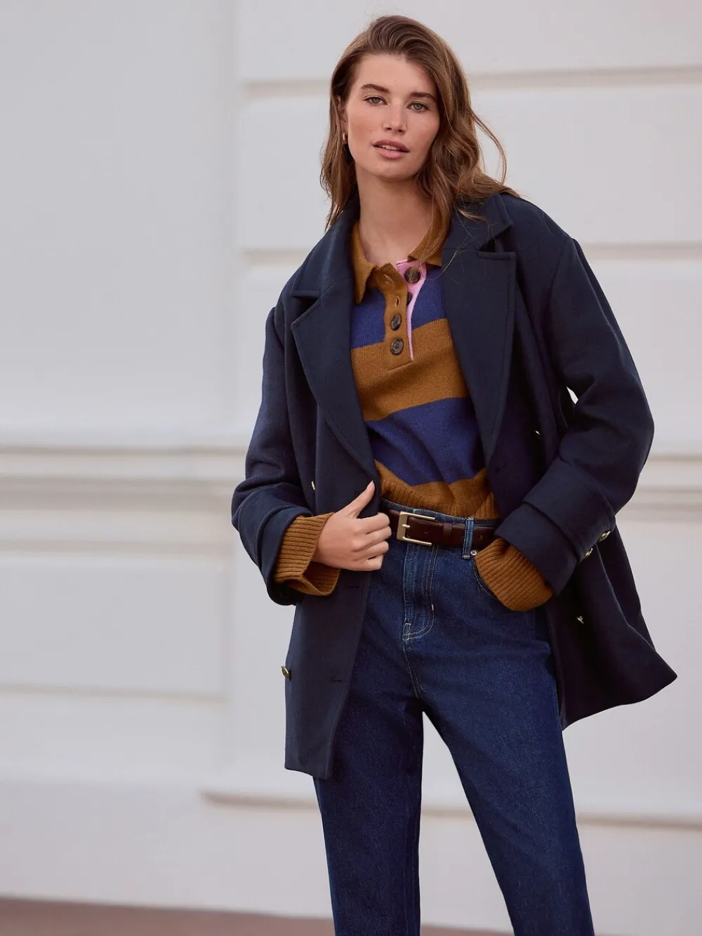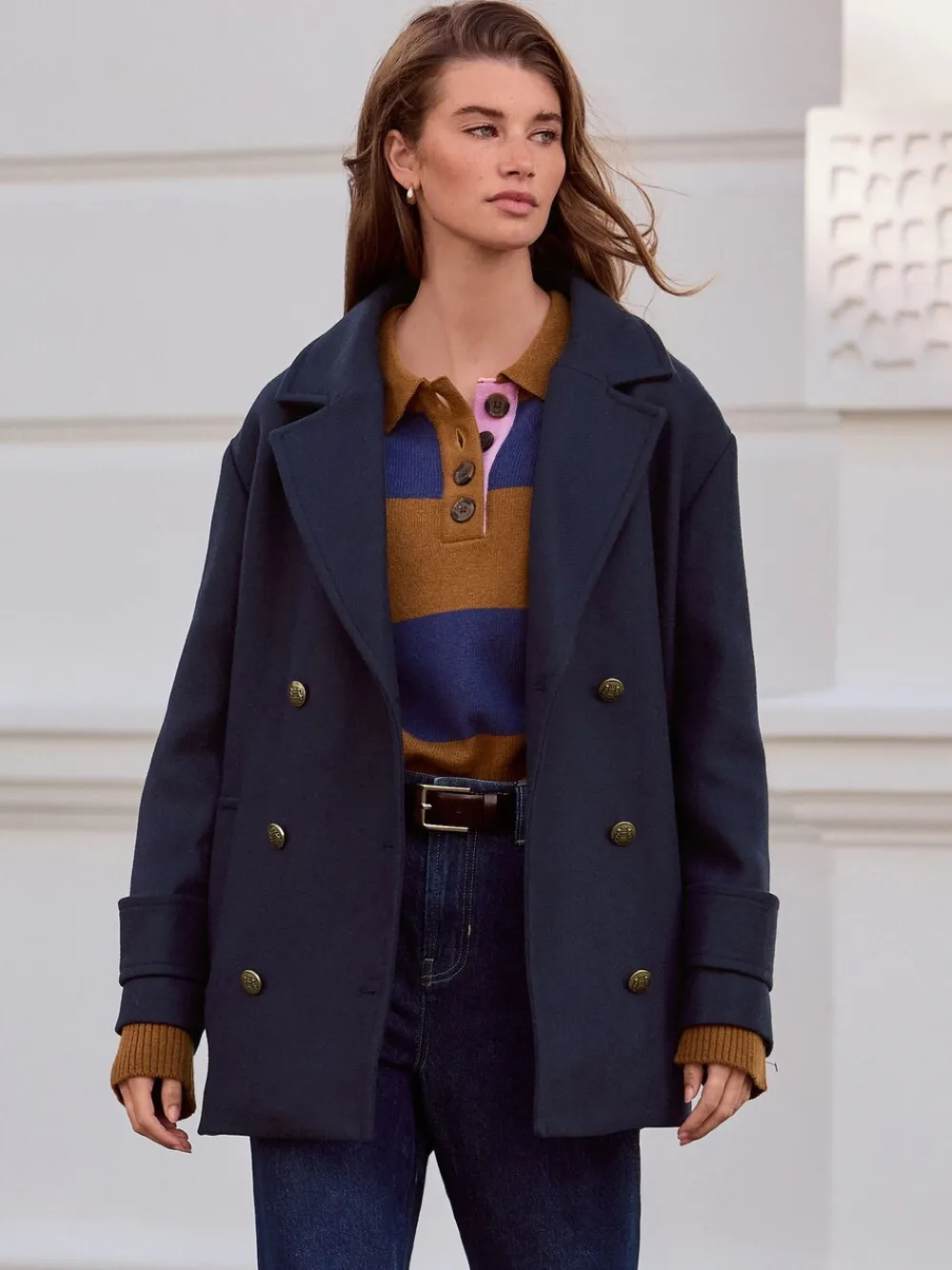 Embrace timeless military style with this premium navy pea coat. Featuring a classic double-breasted design with striking gold-tone buttons and wide lapels, this wool-blend piece is perfect for chic, warm layering this season. Contains wool Double breasted Military style buttons Wide lapel collar Front pockets Standaard van het midden van de nek tot de zoom 30.5″ / 78 cm. Door gespecialiseerde stomerij laten reinigen Buitenkant 46% wol, 34% polyester, 15% acryl, 4% nylon, 1% viscose. Voering 100% polyester.