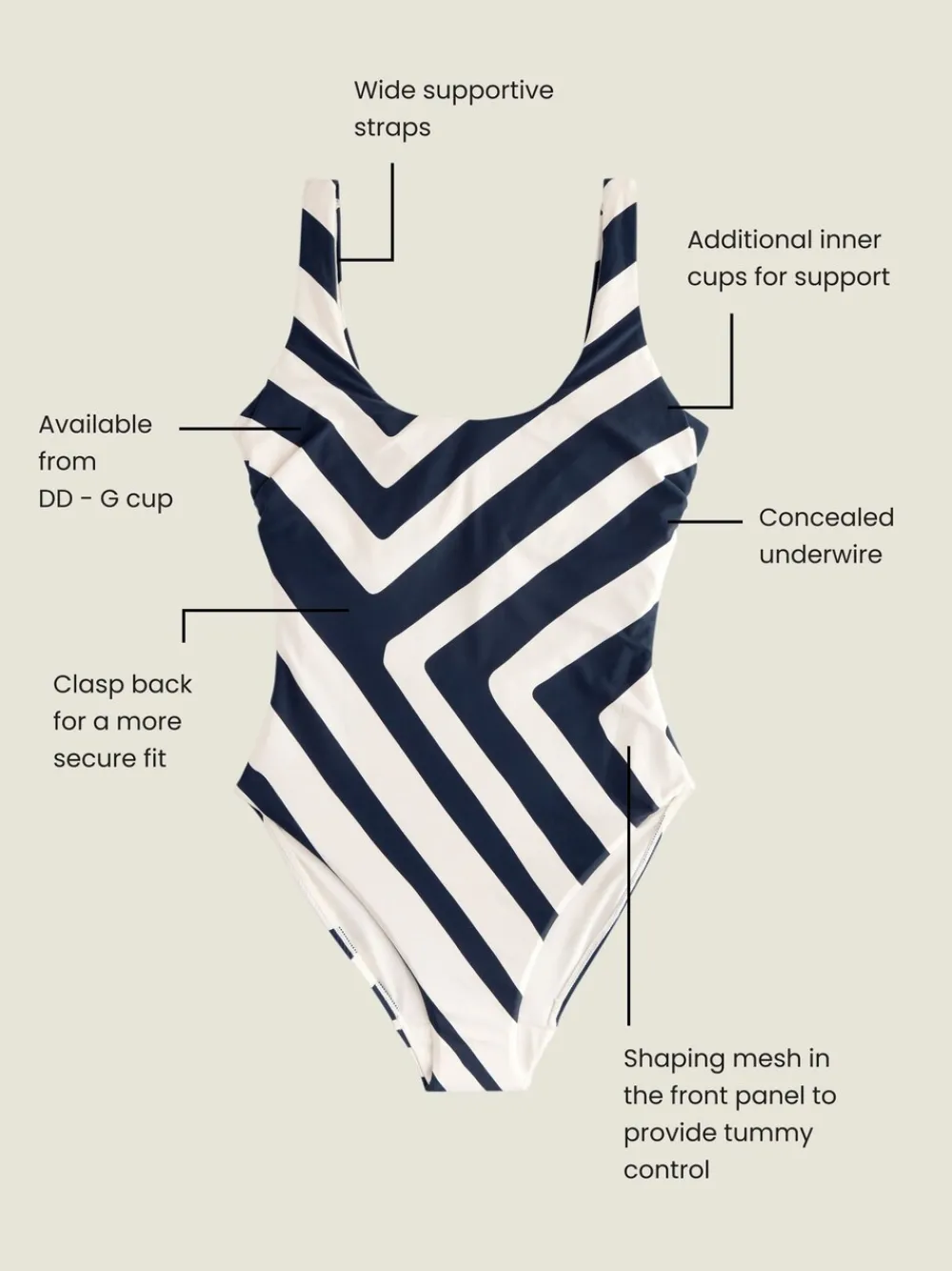 Dit marineblauwe chevron Zwempak is speciaal ontworpen voor cupmaat DD+ en geeft uw zwembadlook een boost. De hoge beenuitsnijding en de lage ronde halslijn zorgen voor een figuurcorrigerende pasvorm, terwijl de verborgen beugels en het corrigerende mesh extra comfort en ondersteuning bieden. Het Zwempak is bovendien gemaakt van stof met een SPF-factor van 50+, waardoor het je beschermt tegen de zonnestralen op bedekte plekken. Cupmaten DD+ Diepe halslijn Buikcorrigerend mesh Verstelbare schouderbandjes SPF-waarde van 50+ Hoge beenvorm Hoofdbestanddeel 85% gerecycled polyester, 15% LYCRA® XTRA LIFE™ elastaan. Voering 92% gerecycled polyester, 8% elastaan. Gaas 88% nylon, 12% elastaan. LYCRA® XTRA LIFE™-vezel zorgt dat je ondergoed er langer als nieuw blijft uitzien met comfort- en pasvormbehoud. Dit innovatieve stretchmateriaal weegt weinig, ademt en behoudt zijn vorm bij telkens weer dragen en wassen. Deze stof voldoet aan BS EN 13758. – 1, zorgt voor bescherming tegen ultraviolette zonnestraling. Het is onafhankelijk getest en heeft een UPF-classificatie van 50+ gekregen, wat meer dan 97,5% van de UV-stralen blokkeert. Belangrijk advies: • Blootstelling aan de zon veroorzaakt huidbeschadiging • Alleen bedekte gebieden zijn beschermd • Gebruik altijd een zonnebrandcrème met een hoge beschermingsfactor voor gebieden van de huid die bloot worden gesteld aan de zon • De bescherming van deze stof kan worden verminderd bij gebruik of als het uitgerekt of nat is • Spoel altijd na elk gebruik af met zoet water • De stof biedt UVA- en UVB-bescherming tegen de zon.