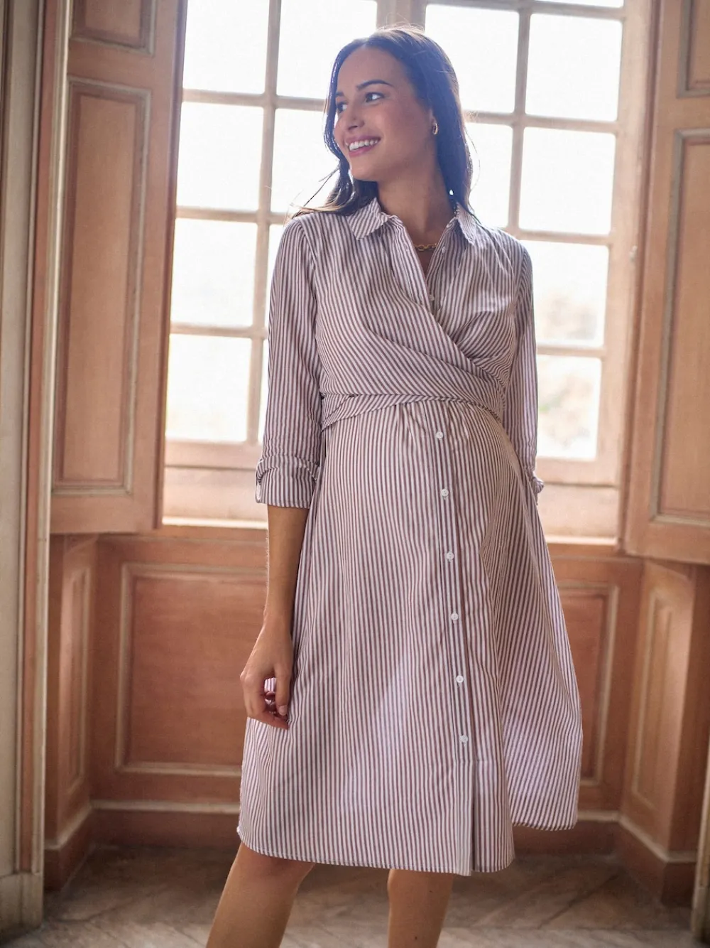 A classic shirt dress, made with mums in mind – our Pinstripe Shirt Maternity & Nursing Dress is perfect before, during & after pregnancy. Ultra-soft, this button-down dress offers an easy A-line fit & a flattering drape throughout your nine months. Chic sash ties cross over & secure at the front to highlight your empire waist, opening up to reveal fuss-free access for breastfeeding after baby is born – not a clip, zip or button in sight. The chic tailored finish complete with pinstripes, collar & adjustable buttoned cuffs makes this a true must-have, perfect for everyday styling. 50% Lyocell. 50% Cotton. Concealed nursing access. Front tie detailing. Trendy button-down shirt design. Adjustable buttoned cuffs. Elasticated empire back. Buy your pre-pregnancy size. With over 20 years of maternity expertise, Seraphine styles are designed to grow with you, adapting with you through pregnancy and motherhood. Machinewasbaar. Lijfje 50% katoen, 50% lyocell. Voering 96% viscose, 4% elastaan.