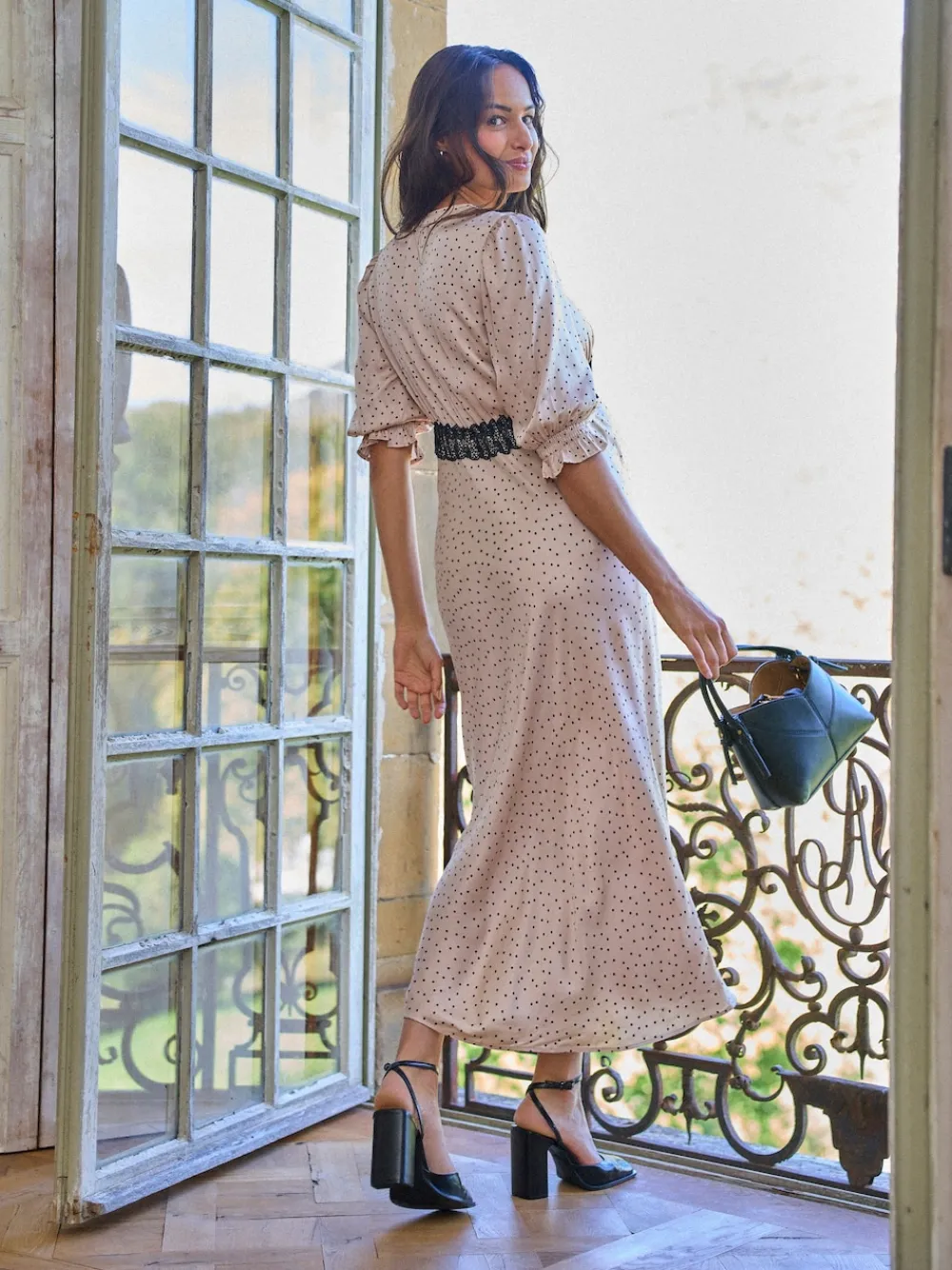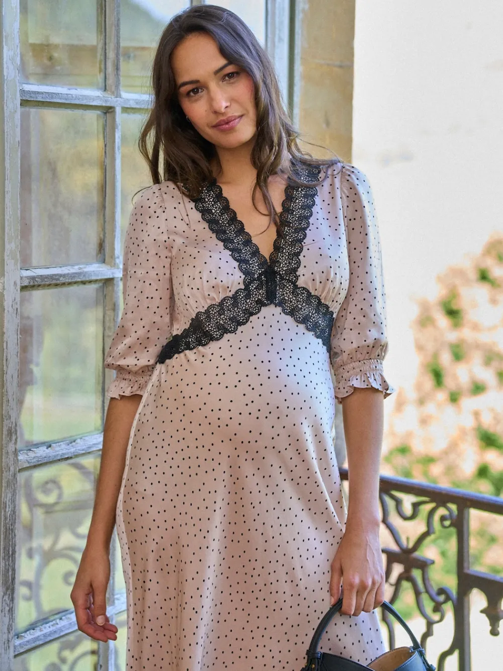 The satin print polka dot dress features a lace trim and a flattering bias cut. The gathered sleeve head with elasticated frill cuff detail adds a delicate touch, while the unlined design keeps it lightweight. With a midi length, this dress offers both elegance and comfort. To ensure the best fit, simply buy your pre-pregnancy size. With over 20 years of maternity expertise, Seraphine styles are designed to grow with you, adapting with you through pregnancy and motherhood. Machinewasbaar. 100% viscose.