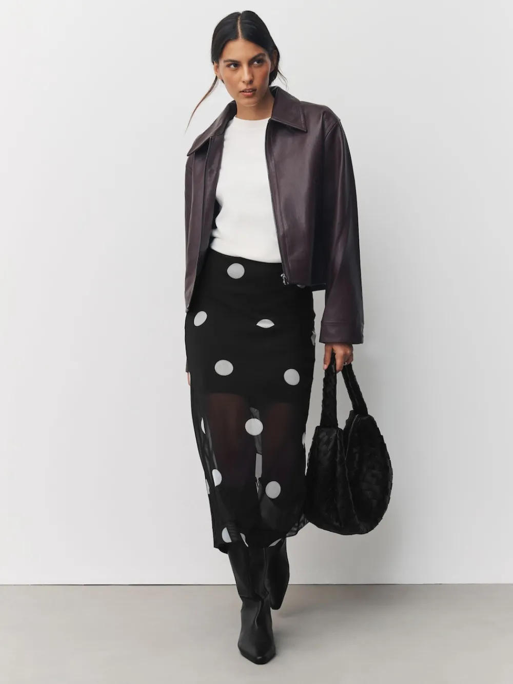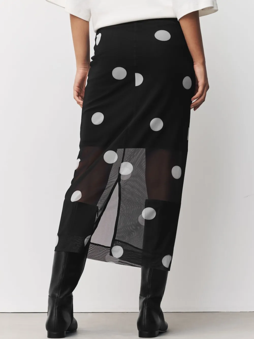 Make a stunning statement in this trendy midi pencil skirt. The black design features a playful polka dot pattern on sheer mesh, giving it a fashionable edge that’s perfect for dressing up or down. Cut in a regular fit, this piece is a versatile wardrobe hero for evenings or chic daytime looks. Sheer mesh fabric Playful polka dot design Flattering pencil shape Regular fit Machinewasbaar. Hoofdbestanddeel 95% gerecycled polyester, 5% elastaan. Voering 100% gerecycled polyester. Artikelen met het curve-logo zijn verkrijgbaar in de maten 18 en groter. Onze tall collectie is ontworpen om te passen bij vrouwen van 5’10” en langer. Dit is verhoudingsgewijs vergroot door het lichaam, de benen en de mouwen om de perfecte pasvorm te bereiken. Verkrijgbaar in maat 8-20.