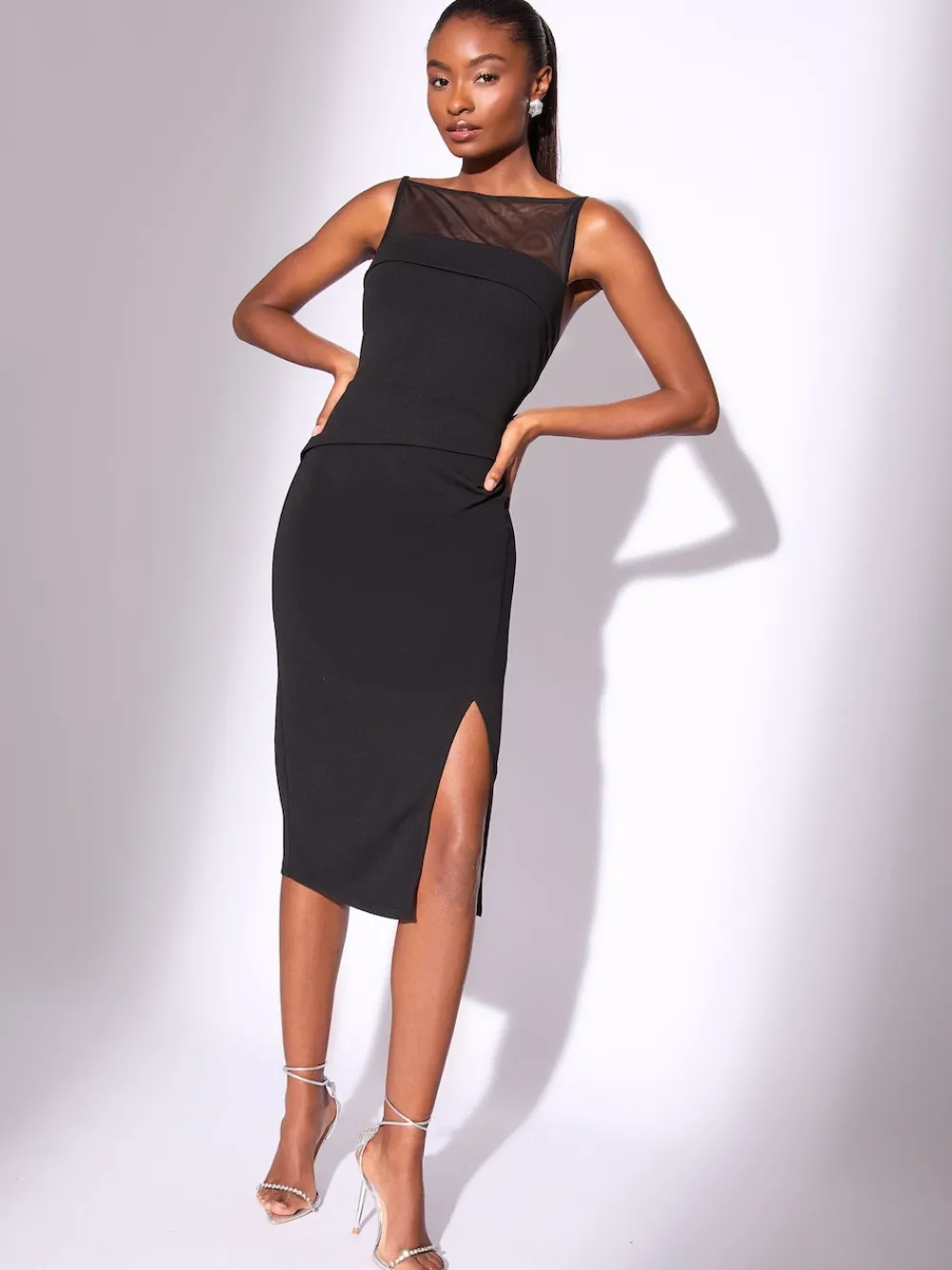 Achieve sophisticated glamour in this sleek sleeveless bodycon midi dress. Crafted from sculpting scuba fabric, the figure-flattering silhouette features a daring side split and elegant mesh yoke detail at the neckline. Perfect for day to night transitions, this dress is essential occasionwear for dinner dates and formal events. Mesh yoke detail Sculpting scuba fabric Sleeveless bodycon fit Midi length with side split Occasionwear Hoofdmateriaal 96% polyester, 4% elastaan. Mesh 92% polyester, 8% elastaan. Voering 100% polyester.