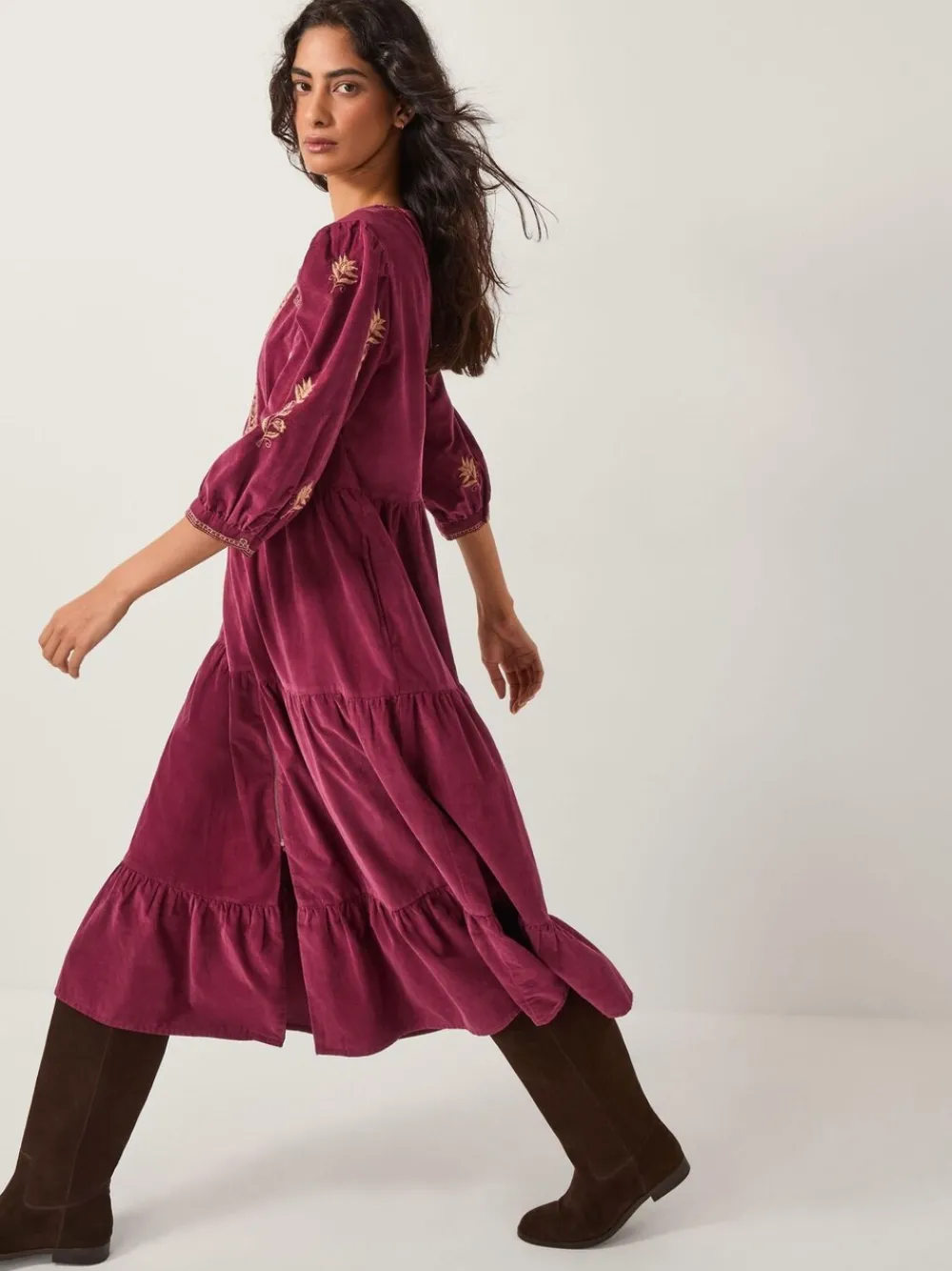 Bohemia looks good on you. Designed with soft corduroy in cherry red, this dress is freshly-picked for your autumn wardrobe. Decorated with embroidered motifs through the V-Neckline, bodice and ¾ sleeves, the tiering hem falls to a midi length, leaving room to show off your favourite boots. Machinewasbaar. 100% katoen.