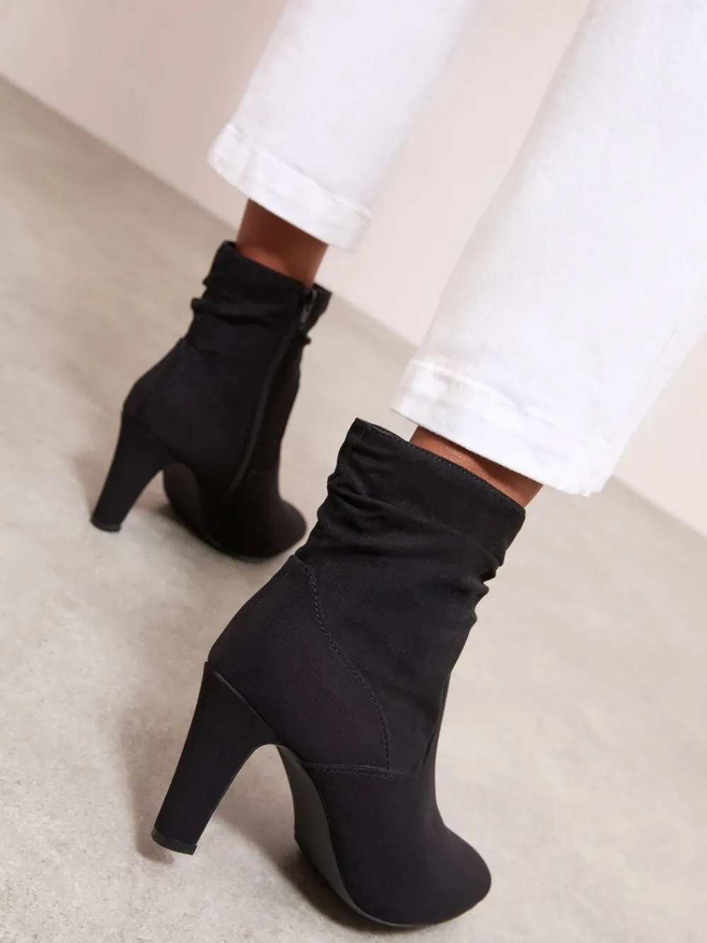 Elevate your everyday outfits with these chic ankle boots. Crafted from soft faux suede, they feature flattering ruched detailing and a stable mid heel for comfort and lift. The almond-shaped toe and side zip fastening complete this versatile, smart-casual staple. Soft faux suede material Ruched detailing Mid block heel Side zipper fastening Bovenwerk – textiel; voering en voetbed – textiel, overige materialen; zool – Andere materialen.