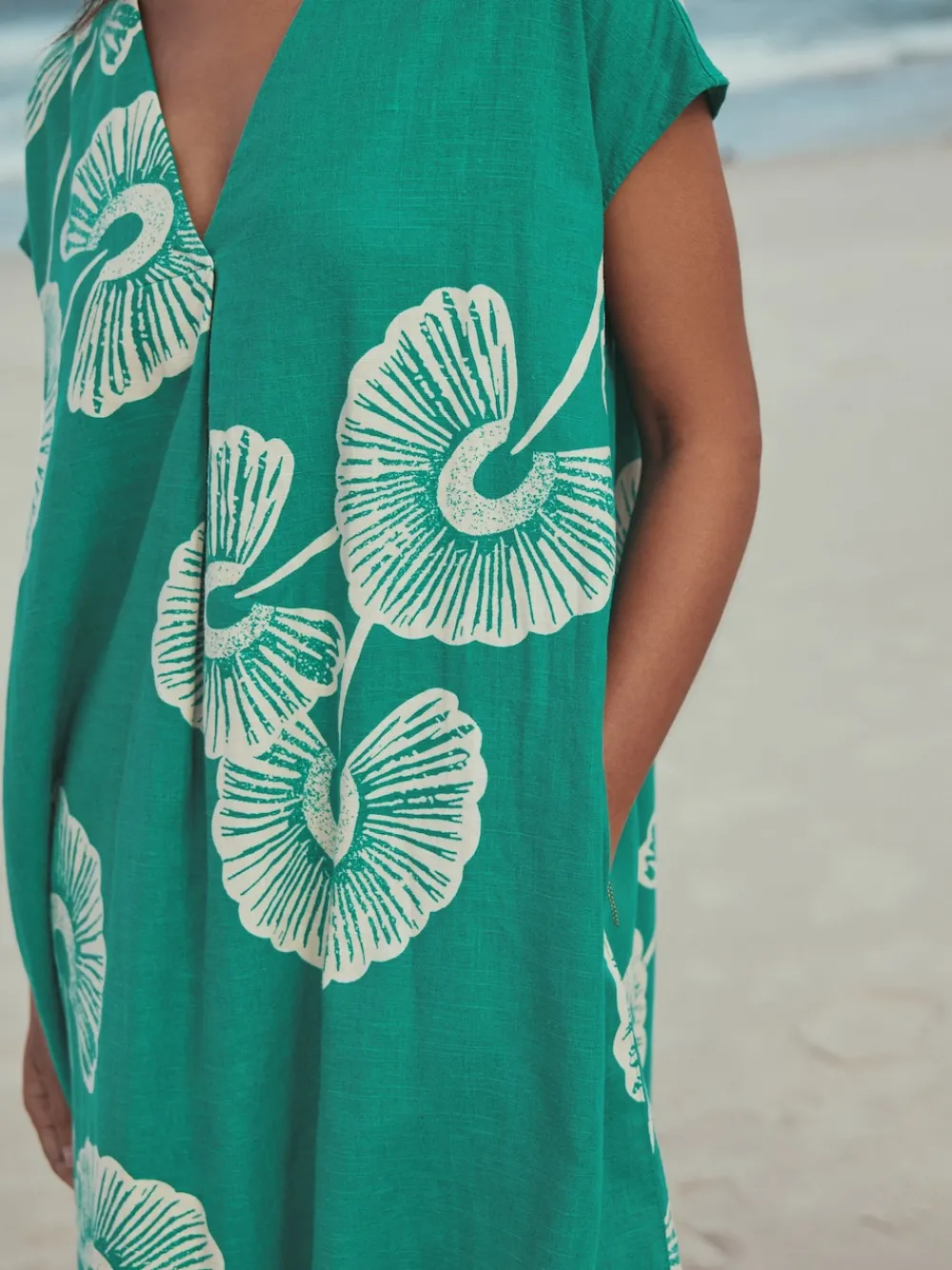 This green floral print Kaftan Mini Dress is the perfect mix of chic and relaxed for summer. Crafted in a lightweight linen-blend, the softly oversized silhouette and gentle V-neck allow you to move freely. Featuring a stylish tile print, short sleeves, useful pockets, and a back pleat detail, this dress is perfect for sundown drinks or your summer holidays. Lightweight linen-blend fabric V-neckline Slightly oversized silhouette With pockets and back pleat detail Standaardmaat van de zijkant van de nek tot de zoom 36.5″ / 93 cm. Machinewasbaar. 55% linnen, 45% Livaeco™-viscose. Artikelen met het curve-logo zijn verkrijgbaar in de maten 18 en groter. Onze tall collectie is ontworpen om te passen bij vrouwen van 5’10” en langer. Dit is verhoudingsgewijs vergroot door het lichaam, de benen en de mouwen om de perfecte pasvorm te bereiken. Verkrijgbaar in maat 8-20.
