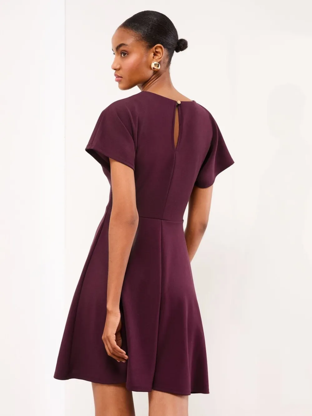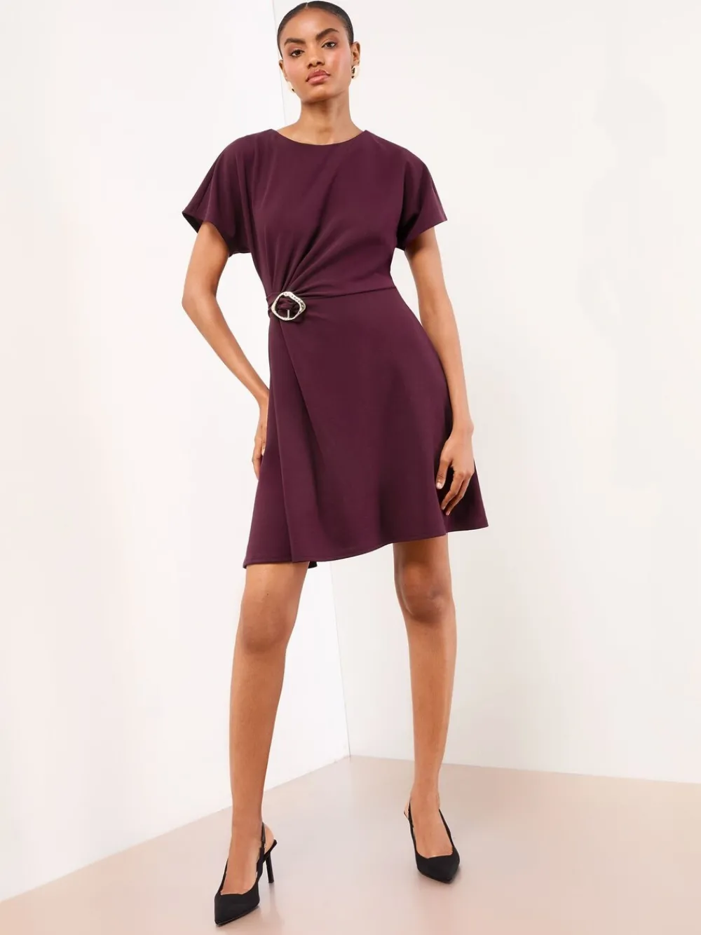 This versatile mini skater dress is perfect for smart occasions and the office. The flattering fit-and-flare skirt and crew neck are elevated by the contemporary hardware detailing at the waist, which cinches the silhouette beautifully. This dress is ideal for formal workwear or sophisticated day-to-night events Crew neck Hardware detail at waist Skater mini skirt Short cap sleeves Dress style Hoofdbestanddeel 97% polyester, 3% elastaan. Voering 100% polyester.