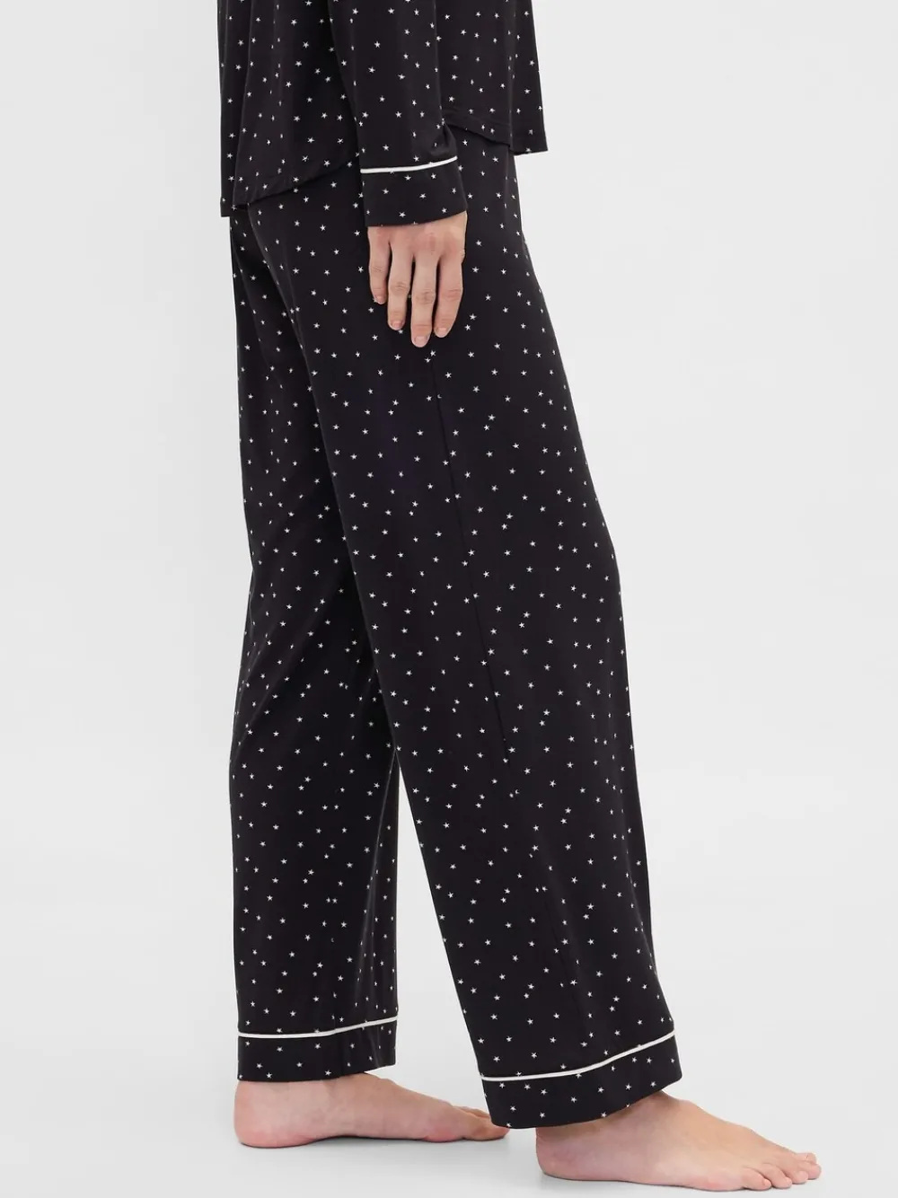 Soft stretch modal-blend pyjamas Trousers. Elasticised waist with drawcords. Piping detail at edges. Certain styles have an all-over print. Machinewasbaar. 89% modal, 11% elastaan.