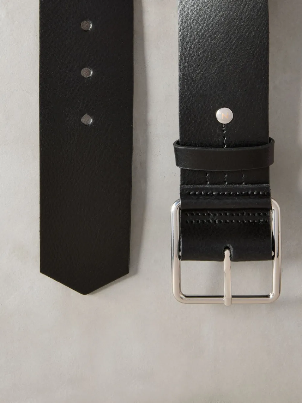 Add a bold finishing touch to your look with this black leather belt, expertly handmade in Italy. The striking wide width and sleek silver-toned hardware create a modern, statement look, while the high-quality leather provides a luxurious feel. It is a versatile accessory that can be worn with jeans or cinched over a dress. Wide width Silver-toned hardware Handmade in Italy Leather material Adjustable fit 100% leer.