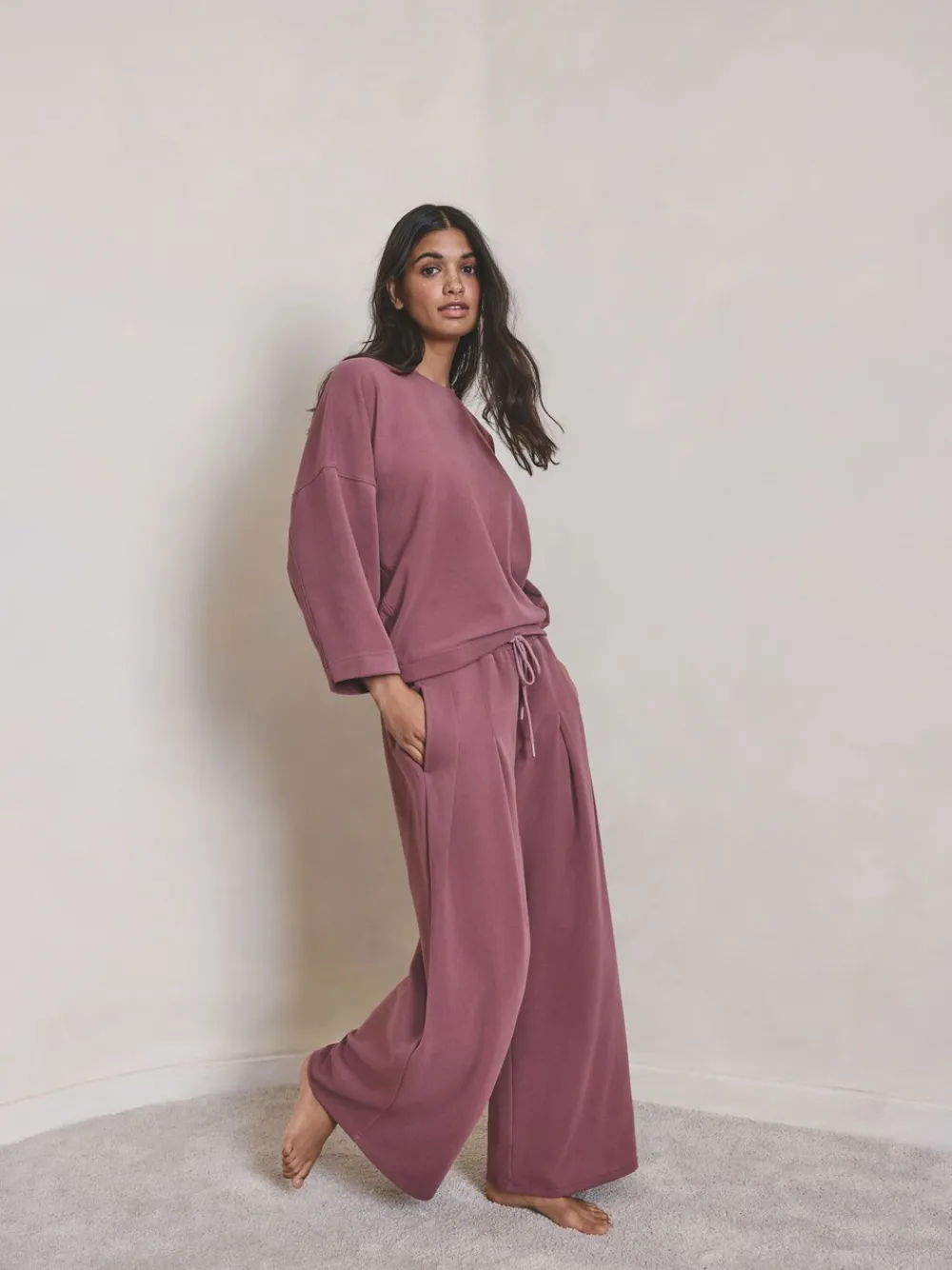 Upgrade your loungewear with these N.Premium brushed wide-leg joggers, blending ultimate comfort with a tailored silhouette. Crafted from super soft brushed fabric, they feature a flattering high-rise drawstring waist and deep front pleats. Perfect for achieving a stylish, relaxed look without compromising on cosy warmth. Wide leg Super soft brushed fabric Drawstring waist detailing High-rise fit Regular voor binnenbeenlengte 29″ / 74 cm. Machinewasbaar. 90% gerecycled polyester, 10% elastaan. Waarschuwing: weg houden bij vuur en vlammen.