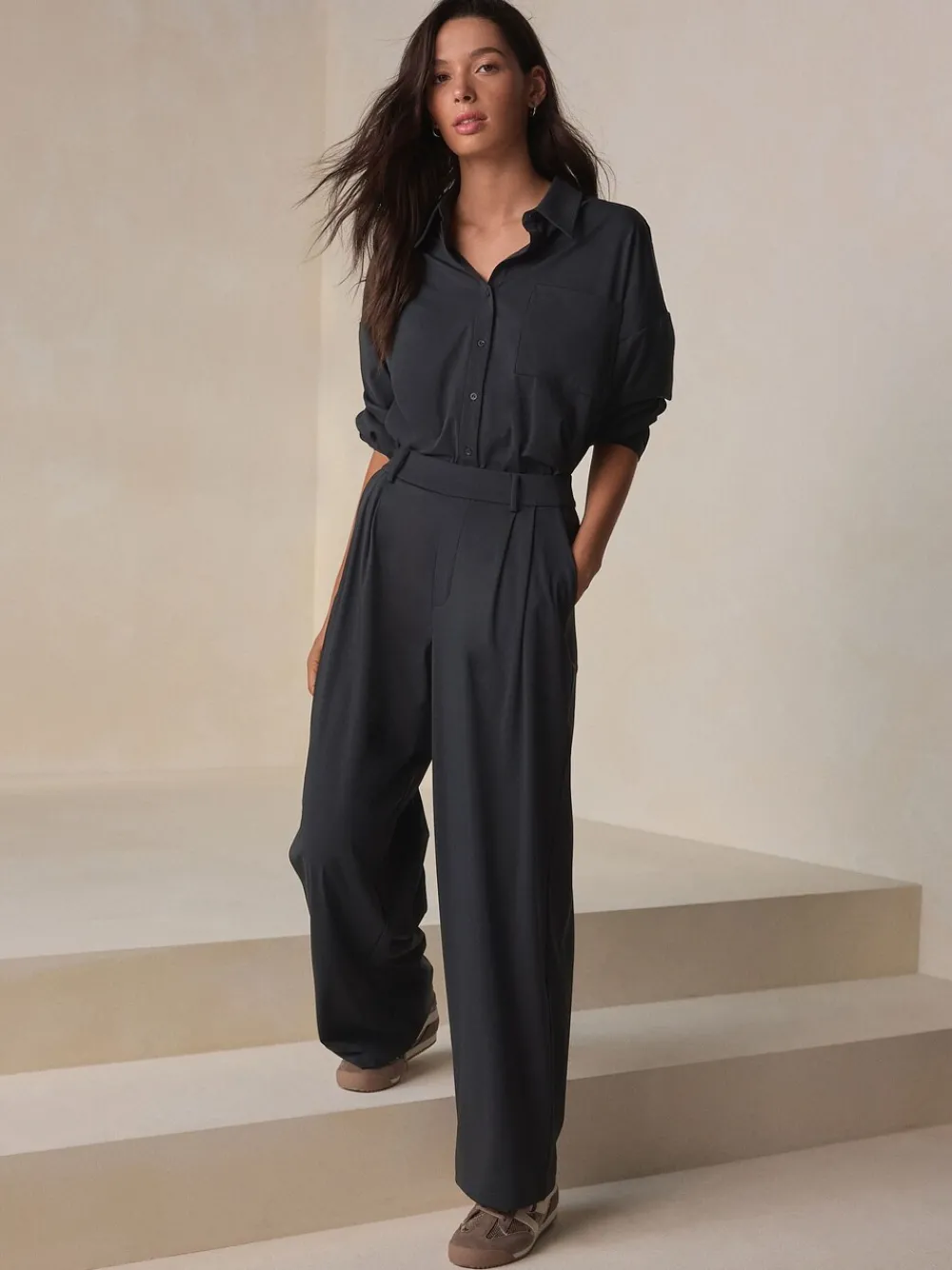 Achieve elevated styling with these sophisticated black jersey tailored trousers. Featuring a flattering high rise and a modern wide leg. The pleated design and full length create a polished silhouette, making these smart jersey trousers perfect for chic office wear or formal day events. High rise, full length Wide leg tailored fit Pleated detail Jersey smart fabric Regular voor binnenbeenlengte 29″ / 74 cm. Machinewasbaar. 73% Nylon, 27% elasthaan.