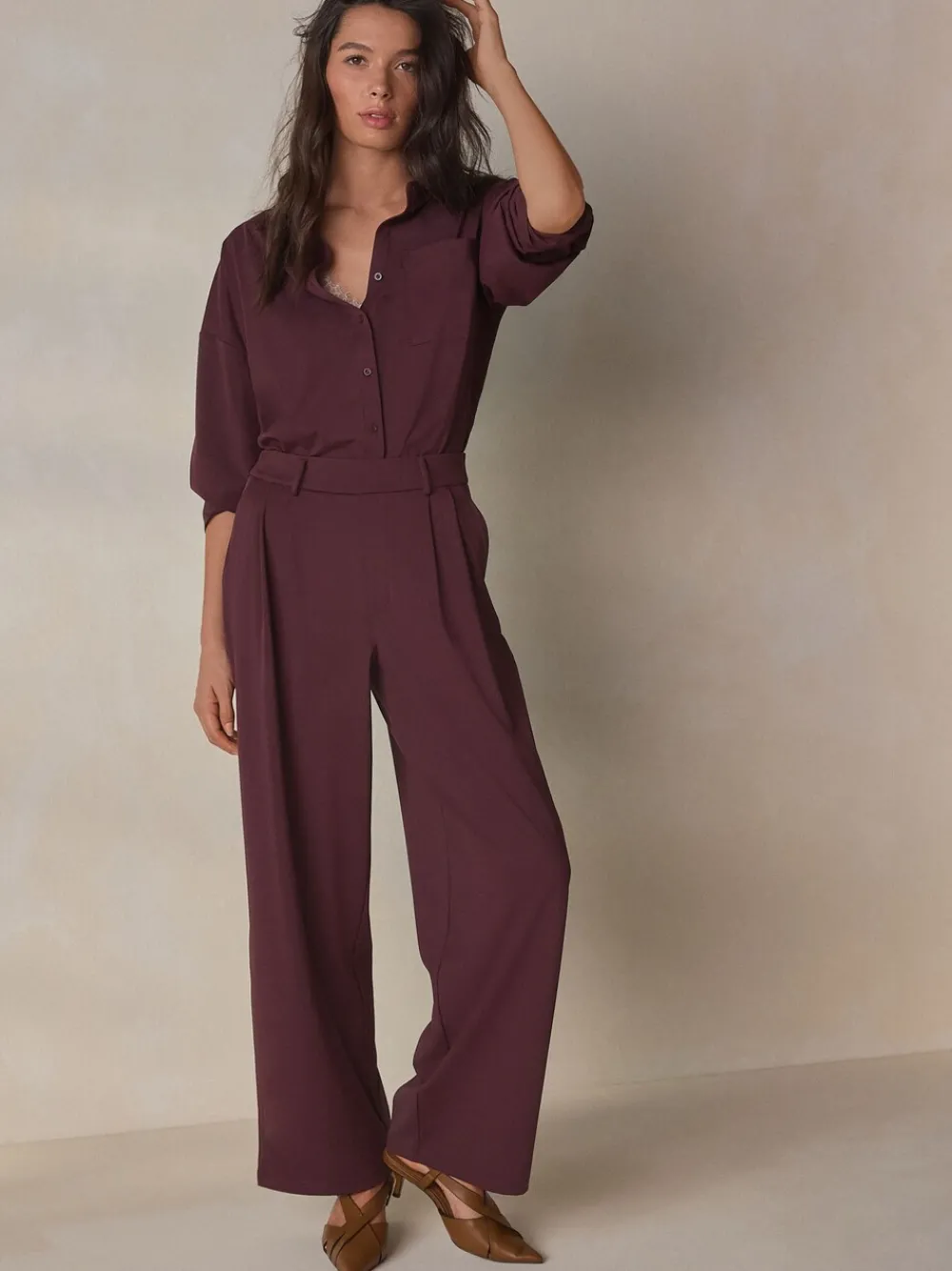 Achieve elevated styling with these sophisticated jersey tailored trousers. Featuring a flattering high rise and a modern wide leg. The pleated design and full length create a polished silhouette, making these smart jersey trousers perfect for chic office wear or formal day events. High rise, full length Wide leg tailored fit Pleated detail Jersey smart fabric Regular voor binnenbeenlengte 29″ / 74 cm. Machinewasbaar. 73% Nylon, 27% elasthaan.