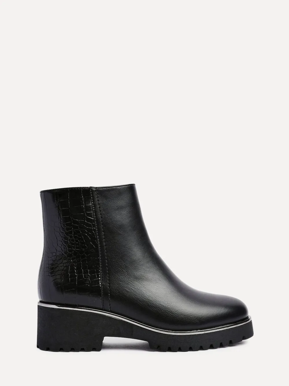 Discover our Navigate ankle boots, featuring a croc-embossed back paired with a sleek metallic trim around the sole. Designed with a plush cushioned insole for maximum comfort with a wedge platform and a faux fur lining. Hakhoogte 5 cm. Bovenwerk – 100% andere vezels, Voering. en sokken – 100% overige vezels. Zool – 100% rubber.